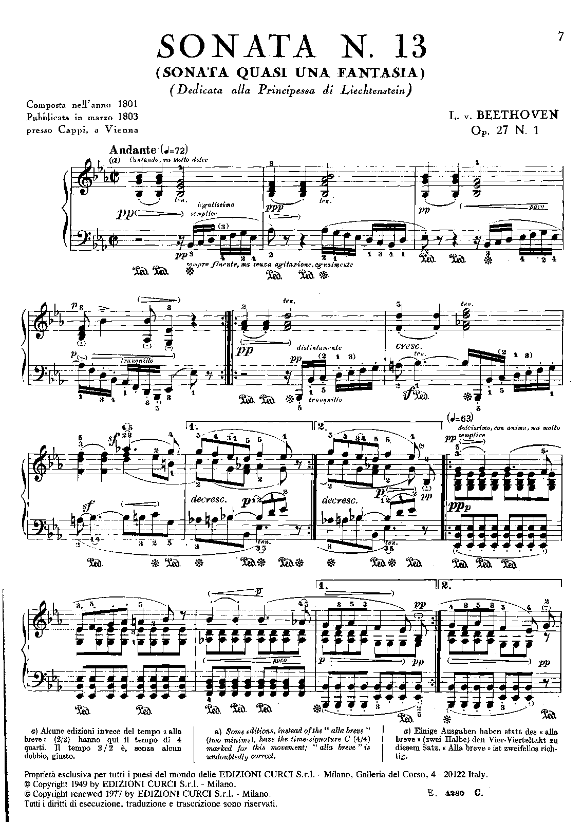 Name Aliases Quasi una fantasia; Piano Sonata No. 13 in E-flat Major, Op. 27, No. 1, "Quasi una fantasia"; Pianosonate nr. 13 (Beethoven); Sonata para piano n.º 13 en mi bemol mayor Op. 27 n.º 1