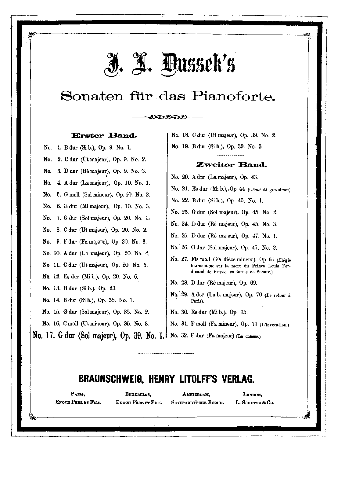 Like many of Dussek's sonatas this is in 2 movements (or three in this case, the Andantino going attacca into the Allegro), though in this case with no real movement breaks (at least in the 1961 edition) and an odd, fantasiacal finale