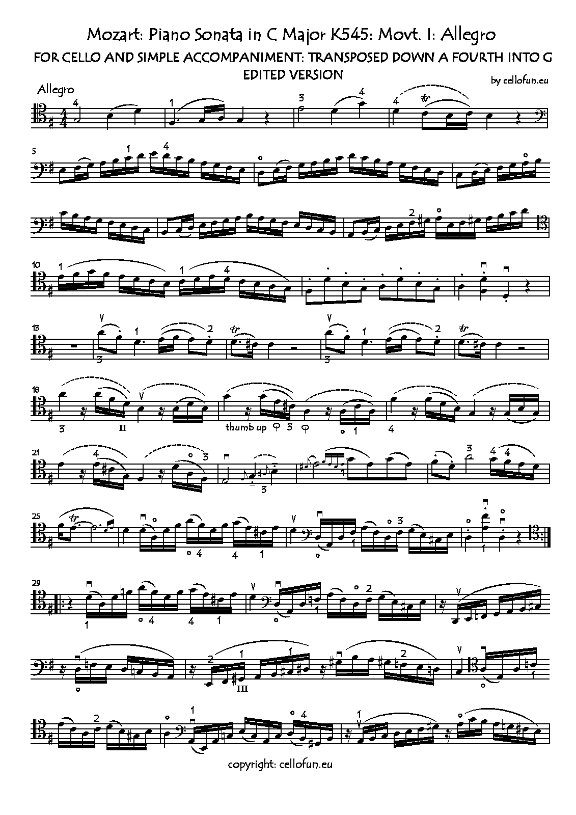 Misc. Notes Complete sonata. Transposed down a fourth into G major. Three versions of the cello part are offered: "Edited" (with fingering and bowing suggestions), "Clean" (only the notes) and an Easier Version. The accompaniments (simple, unelaborated) can be played by piano or other instruments. Accompaniment parts for a second cello are also offered. For best results, print on A4 paper with no margins. More information at cellofun.eu