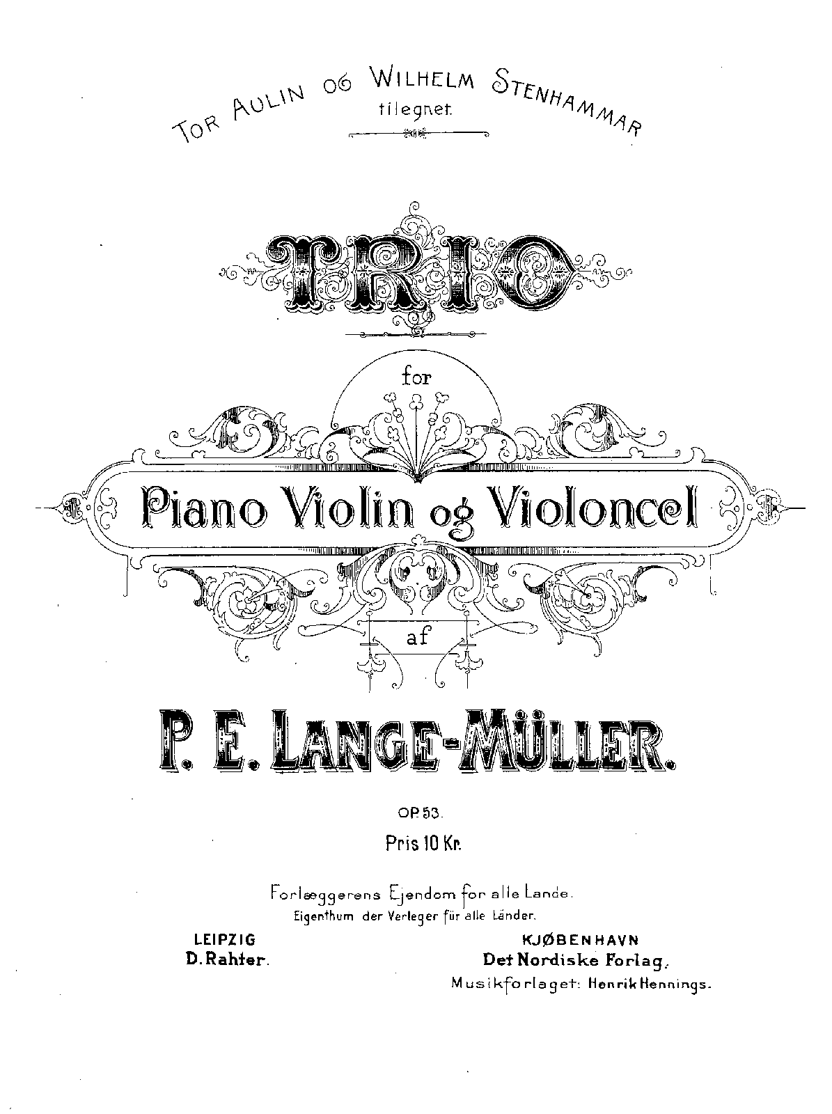 Notes to Da Capo 8.226119 claim composed 1890, published 1898 and premiered 1900. One wonders perhaps if at some point it was at least privately performed by Aulin (violin) and Stenhammar (piano) (was Lange-Muller a cellist?) (or perhaps Aulin performed Lange-Muller's violin concerto in C - still unpublished !? - and the dedication has to do with that? But that may have been a later work.)