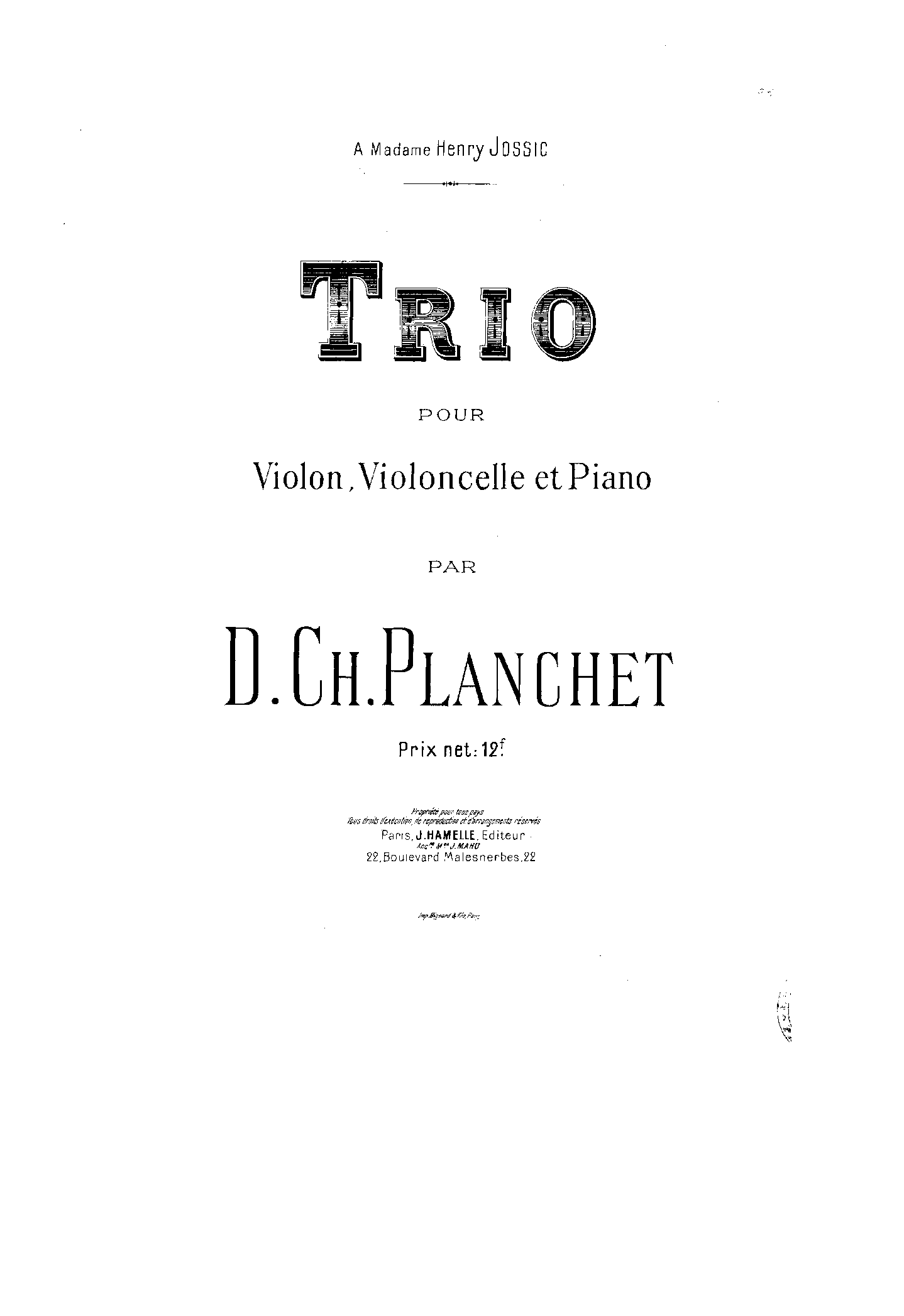 A piano trio by Planchet (this one?) is mentioned in the August 1, 1903 Musical Times, p.567 among New Foreign Publications. It also fits with the Hamelle plate table...