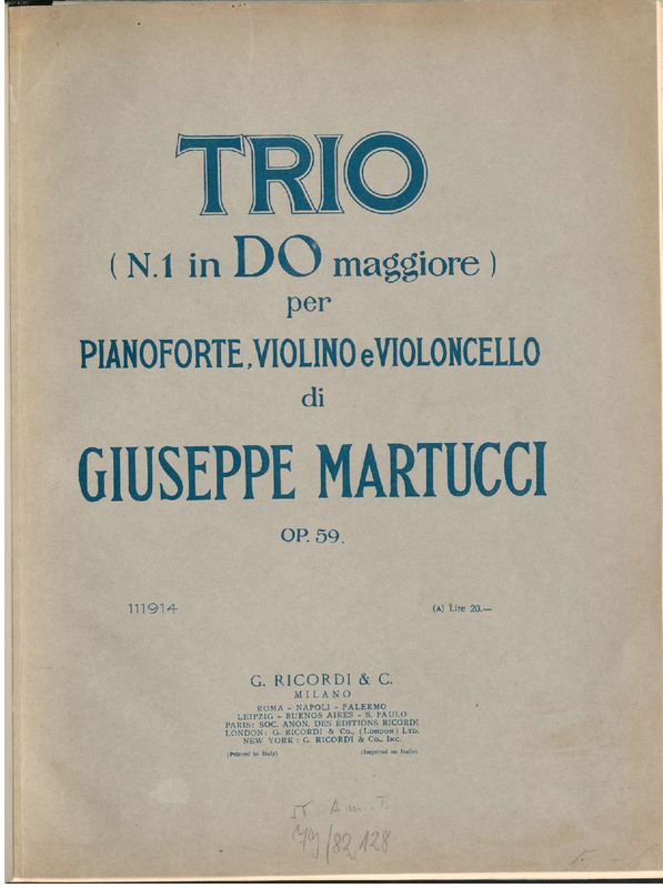 Publication by Lucca of Milan (not Ricordi, at first!) noted in the 31 March 1884 issue of the Bibliografia d'Italia, page 72. Silvertrust edition claims to be essentially a reprint of the Lucca edition of ca.1884 (and has Allegro giusto, Scherzo, Andante con moto, Allegro risoluto; this is more or less what the Burato/Ghidoni/Bosna trio has also.)