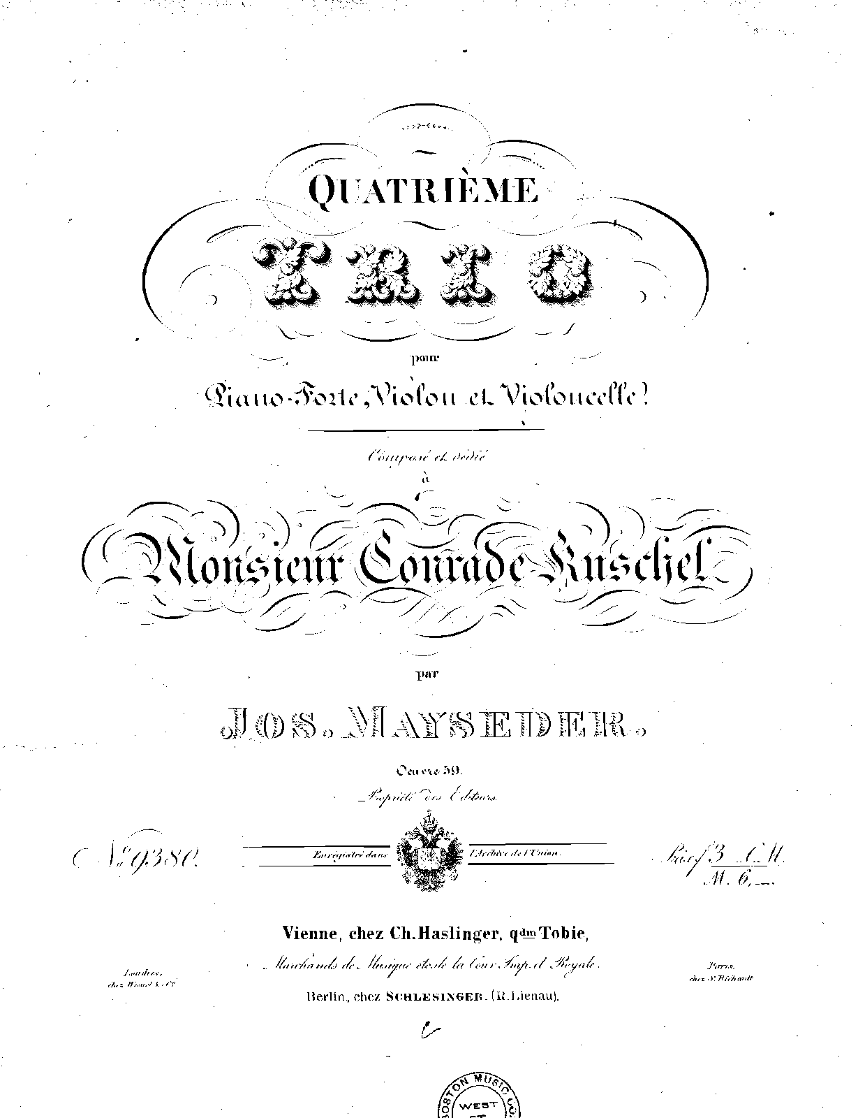 Also published by Richault. Publication noted in the Bibliographie de la France 1e série, 33e année (47e de la collection), Nº 33, 17 Août 1844, p.432, r.102.