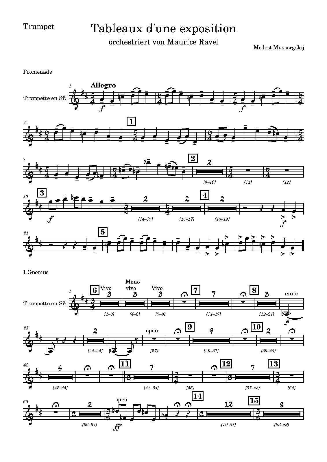 ⇒ 15 more: Promenade I • 1. Gnomus • Promenade II: Moderato commodo assai e con delicatezza • 2. Il Vecchio Castello • Promenade III: Moderato non tanto, pesamente • 3. Tuileries (Dispute d'enfants après jeux) • 4. Bydło • Promenade IV: Tranquillo • 5. Балет невылупившихся птенцов • 6. "Samuel" Goldenberg und "Schmuÿle" • 7. Limoges, le marché (La grande nouvelle) • 8. Catacombæ (Sepulcrum romanum) • Cum mortuis in lingua mortua • 9. Избушка на курьих ножках (Баба-Яга) • 10. Богатырские ворота (В стольном городе во Киеве)