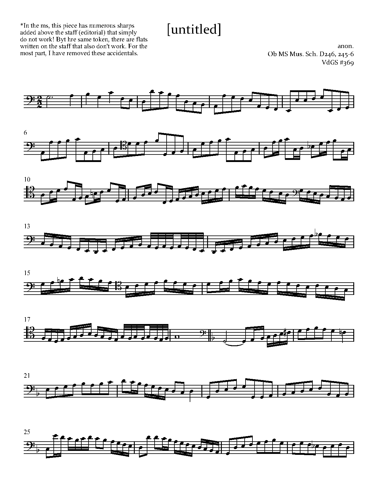 Ob MS Mus. Sch. D245, 246, 247 is a very sizable collection of pieces for viols, compiled by John Merro in the late 1620s or early 1630s. Buried in those 3 volumes are a number of works seemingly for viola bastarda - they are elaborate embellishments/divisions for unaccompanied bass viol. The works on which they are based cannot always be determined, but one piece is labeled "Sound out my voyce" and bears the name 'Alfonso' which enables the identification of Alfonso Ferrabosco ii. (Sound out my voyce is an 'Englished' version of Palestrina's Vestiva i colli, that had appeared in Musica Transalpina in 1588.) The 8 pieces included here are therefore all tentatively attributed to Ferrabosco ii.