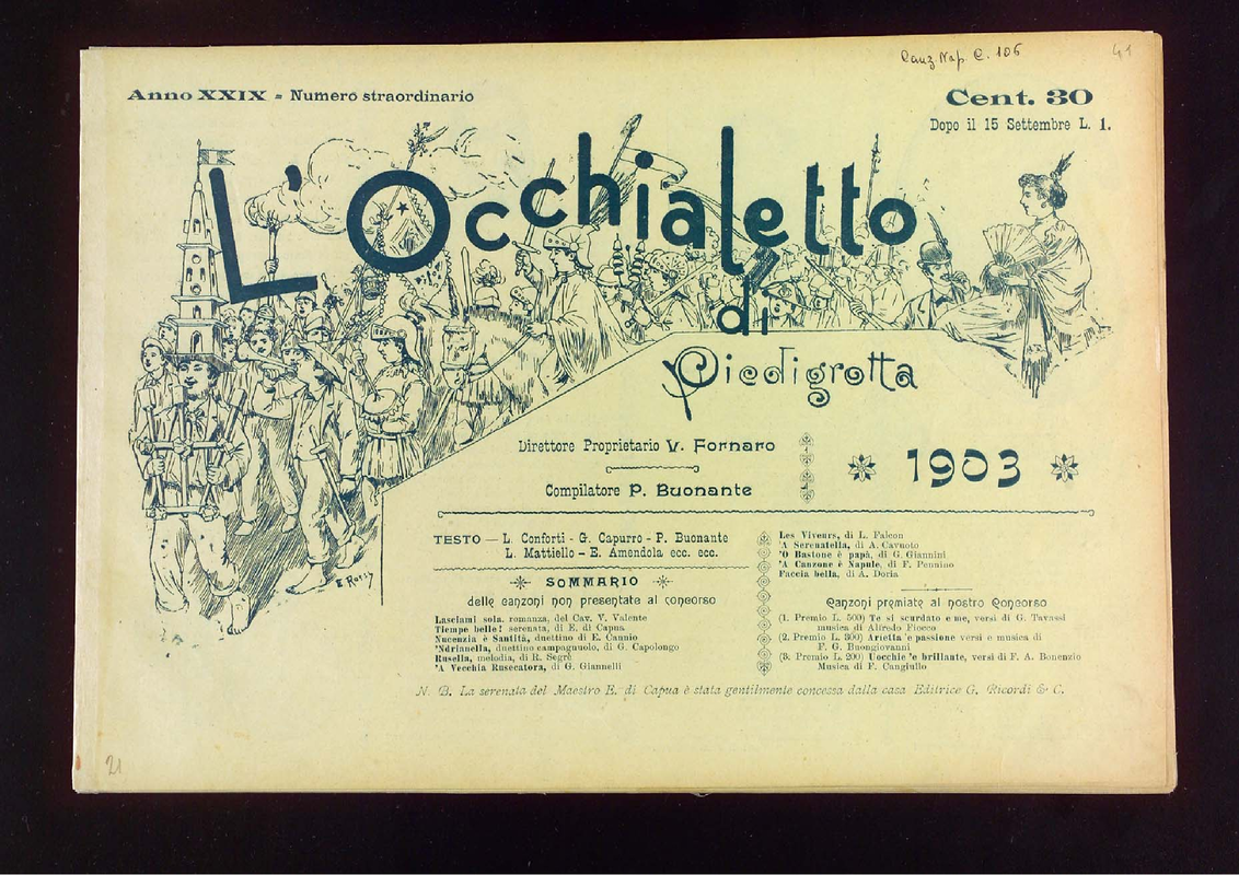 | Librettist | G. Morelli (1) Giuseppe Giannelli (2) L. Mattiello (3, 4, 10, 37) F. Feola (5, 9) E. Parziale (6, 41) Vincenzo Russo (7, 8, 16, 29) Francesco Cangiullo (11, 12, 27) G. Recupito (13) Pasquale Buonante (14) Ferdinando Russo (20, 21, 24) Aniello Califano (17, 25) Trilussa (18) Giambattista De Curtis (23) Léon Suès (15) E. Pica (22) V. Di Caprio (26) Giovanni Francesco Buongiovanni (30, 32) Adolfo Genise (28) G. Tavassi (31) Francisco Achille Bonenzio (33) F.S. Tuzzoli (34) Pasquale Cinquegrana (35) A. Federici (36) M. Vocaturo (38) Antonio Barbieri (39) E. de Cesare (40) |