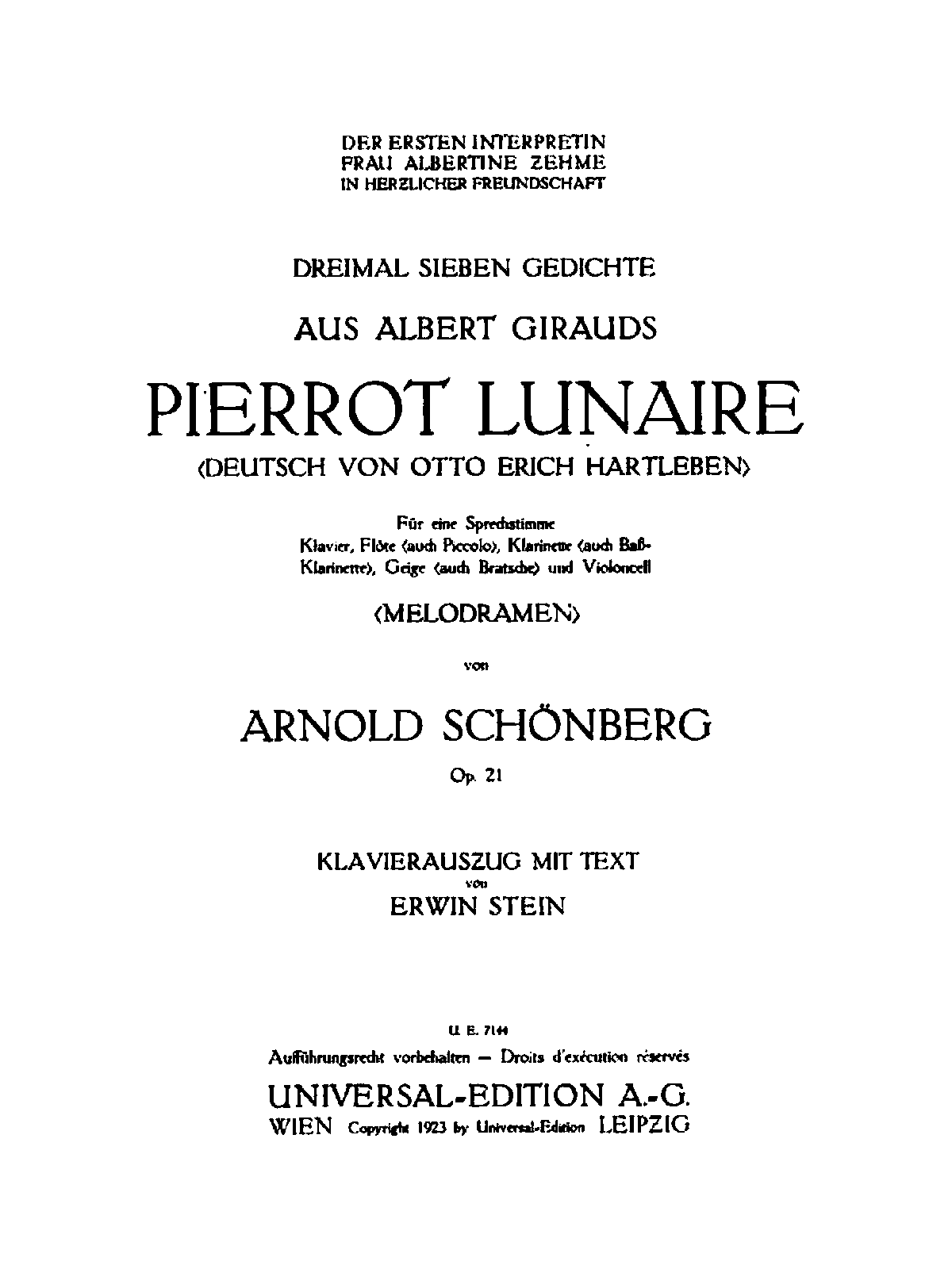 Name Aliases Dreimal sieben Gedichte aus Albert Girauds "Pierrot lunaire"; Pierrot Lunaire, Op. 21; Op. 21; Schönberg Op. 21; Schoenberg Op. 21; Pieroto Lunatika; 月迷彼埃罗; 月下小醜; 月迷彼埃羅