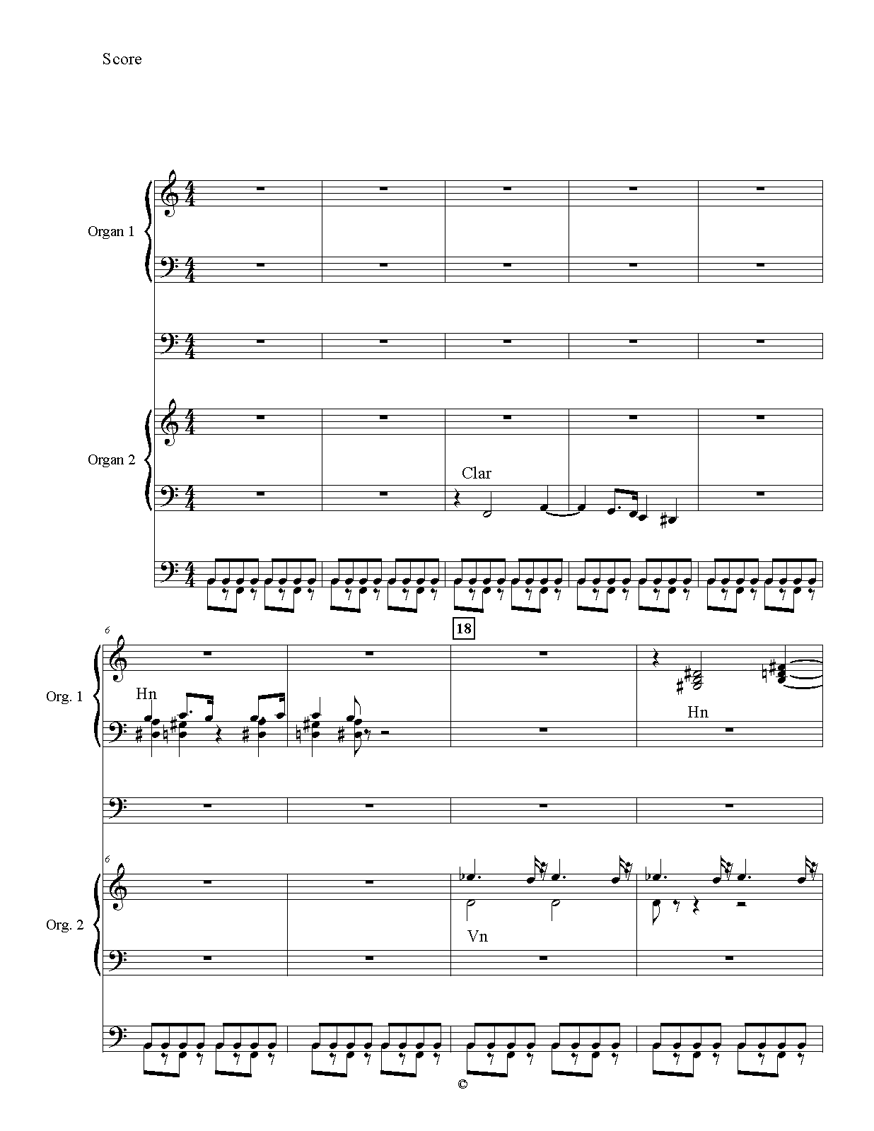 ⇒ 19 more: Oboes 1, 2, English Horn • Clarinet 1, 2, Bass Clarinet (B♭/A) • Bassoon 1, 2, Contrabassoon • Horn 1, 2, 3, 4, (5, 6 for optional Buccine replacement) • Trumpet 1, 2, 3, (4 for optional Buccine replacement), / Offstage Trumpet (C) • Trombone 1, 2, 3, Tuba • Buccine 1, 2, 3, 4, 5, 6 • Timpani • Glockenspiel • Bass Drum, Cymbals, Tambourine, Tamtam, Raganella, Triangle • Piano • Celesta • Organ • Harp • Violins I • Violins II • Violas • Cellos • Basses