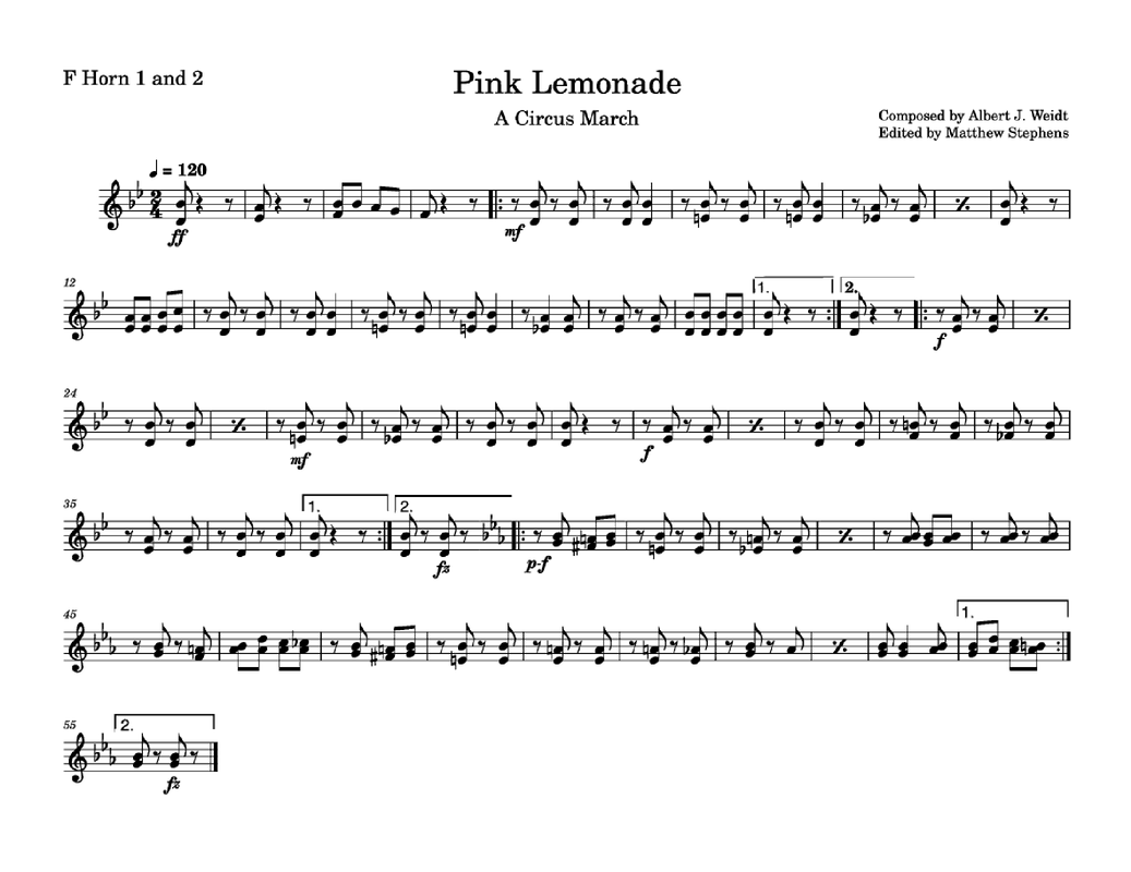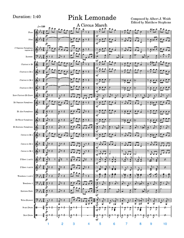 ⇒ 30 more: Oboe/Soprano Saxophone (C) • Bassoon • Clarinet (E♭) • Clarinet Solo (B♭) • Clarinet 1 (B♭) • Clarinet 2/3 (B♭) • Soprano Saxophone (B♭) • Alto Saxophone (E♭) • Tenor Saxophone (B♭) • Baritone Saxophone (E♭) • Cornet (B♭, Conductor) • Cornet Solo (B♭) • Cornet 1 (B♭) • Cornet 2 (B♭) • Cornet 3 (B♭) • Horn 1 (E♭) • Horn 2 (E♭) • Horn 3/4 (E♭) • Tenor Horn 1 (B♭) • Tenor Horn 2 (B♭) • Trombone 1 • Trombone 2 • Trombone 3 • Bass (or Trombone 3) (B♭) • Baritone (Treble Clef) • Baritone (Bass Clef) • Basses • Snare Drum • Bass Drum • Bells
