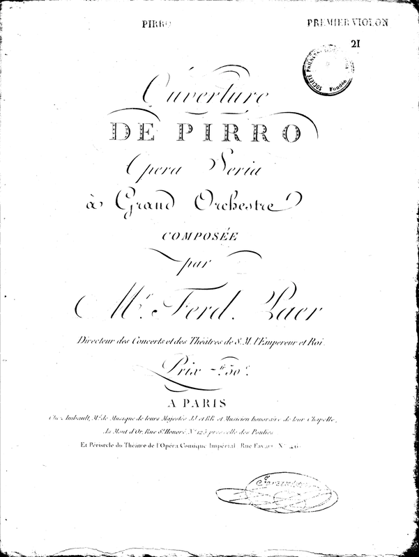 This work does not appear in Grove Music's work list for Paër, and a basic internet search does not come up with anything that indicates whether it was for voices, chorus, and orchestra, or just voices and orchestra. Given the period in which it was written, it probably did have a chorus, so it is tagged as such, but if the complete score does come to light, this tag may have to be changed. The language is also a guess, based on the spelling of the title.