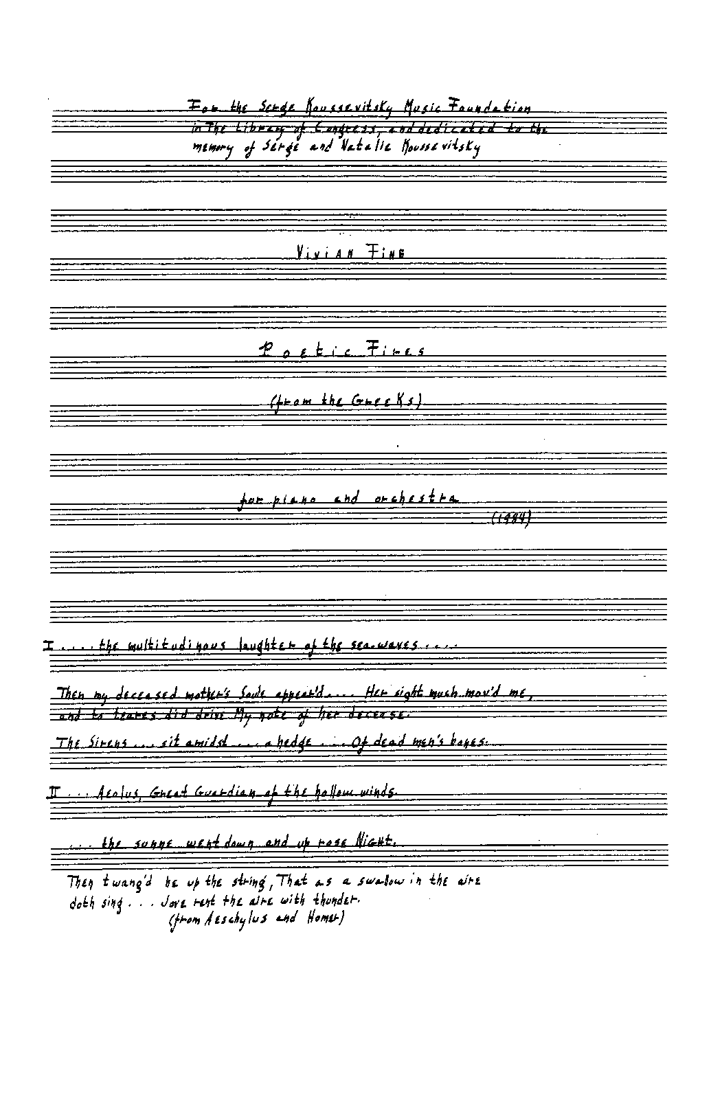 Fine returned to a favorite theme, Greek mythology, using short passages by Aeschylus and Homer containing imagery of sea waves, the appearance of a deceased mother, Sirens amidst a hedge of dead men’s bones, Aeolus and hollow winds, Night, and Jove’s harp. The text’s imagery becomes the character for that section, suggesting linear shapes and orchestration…The piano is not a solo instrument as in a concerto, but a member of the orchestra whose timbre Fine mixes with other instruments and occasionally features in a solo passage....Fine experimented with unusual orchestral doublings and swathes of orchestral colors. There are passages in which the glockenspiel doubles a trumpet and an English horn doubles a flute: the bassoon repeats a previous piano passage; and the sections about the sirens beings with a cello solo repeated by the contra bassoon. Bassoon, xylophone, and piano are mixed during the section about Aeolus. It is almost as if Fine considers the instrumental timbres to be dancers whom she features in solos and small ensembles.