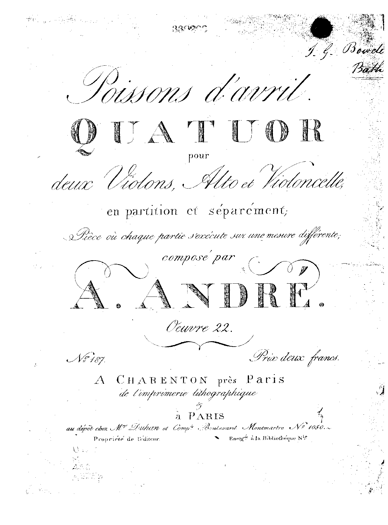 | Alternative. Title | Poissons d'avril. Quatuor pour deux violons, alto et violoncelle, en partition et séparèment; Pièce ou chaque partie s'exécute sur une mesure différente |