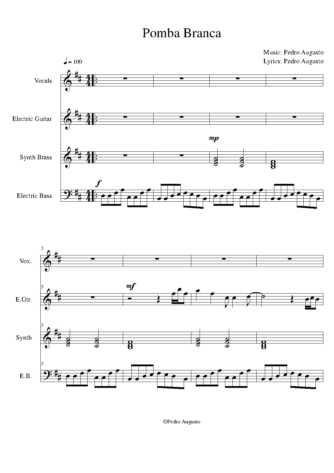 This composition is part of an Album collection that will be first published as a four-volume score music book entitled "Fluxo-inspiration: 35 years of songs" (in portuguese, its published language: "Fluxo-inspiracao: 35 anos de musica") containing the following four volumes: I) Love & Peace (13 compositions); II) Ecology & Fado (12 compositions); III) Rock & Blues (13 compositions); IV) Instrumentals (13 compositions). "Pomba Branca" (White Pigeon) was composed in 1987, being the second composition of the author. It will be included in the volume I, part 3 of the Album collection.