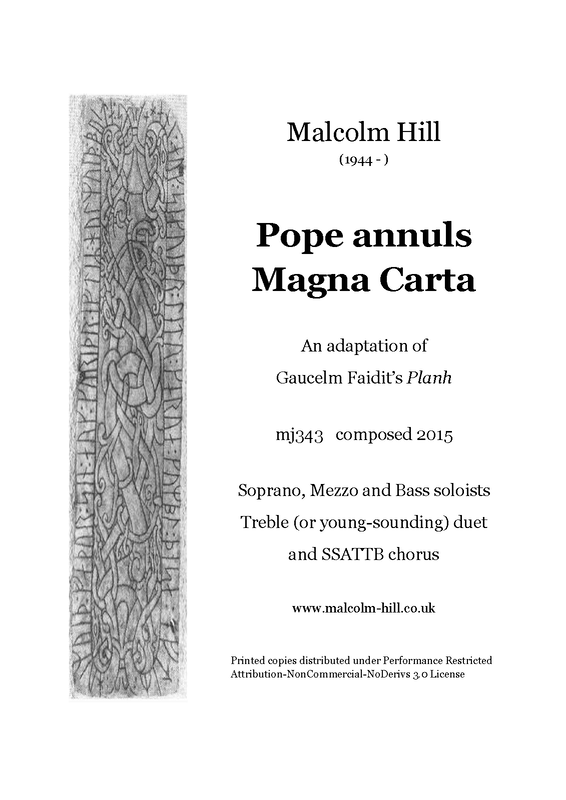 The French troubadour poet-musician Gaucelm Faidit (1170-1202) composed a Planh on the death of the English Richard the Lionheart in 1199. Malcolm Hill took Faidit’s rhythm, melody and unusual metrical scheme and fitted them around a text based on Pope Innocent III’s letters to England of 1213 and 1215. Thirteenth century compositional methods were applied throughout the resulting motet. Soloists (singing only in English) act either as narrators or translators of the Latin (sung by the chorus) of the Pope’s letter. The main body of the piece involves a dramatic soprano soloist singing against a 6-part chorus.