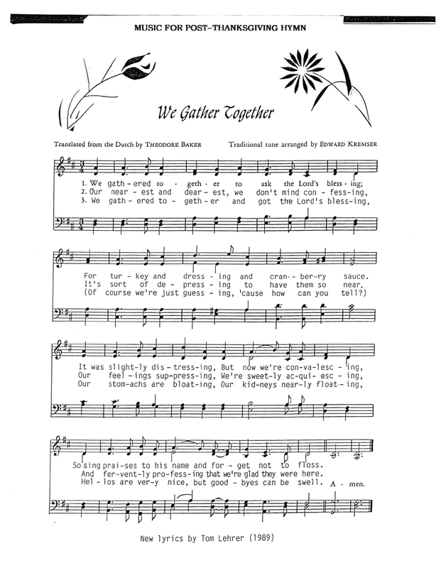 | Extra Information | Words by Tom Lehrer. Music: hymn tune “Kremser” (as in “We gather together to ask the Lord’s blessing”), trad. Dutch arranged by Eduard Kremser (1838–1914) (1877) |