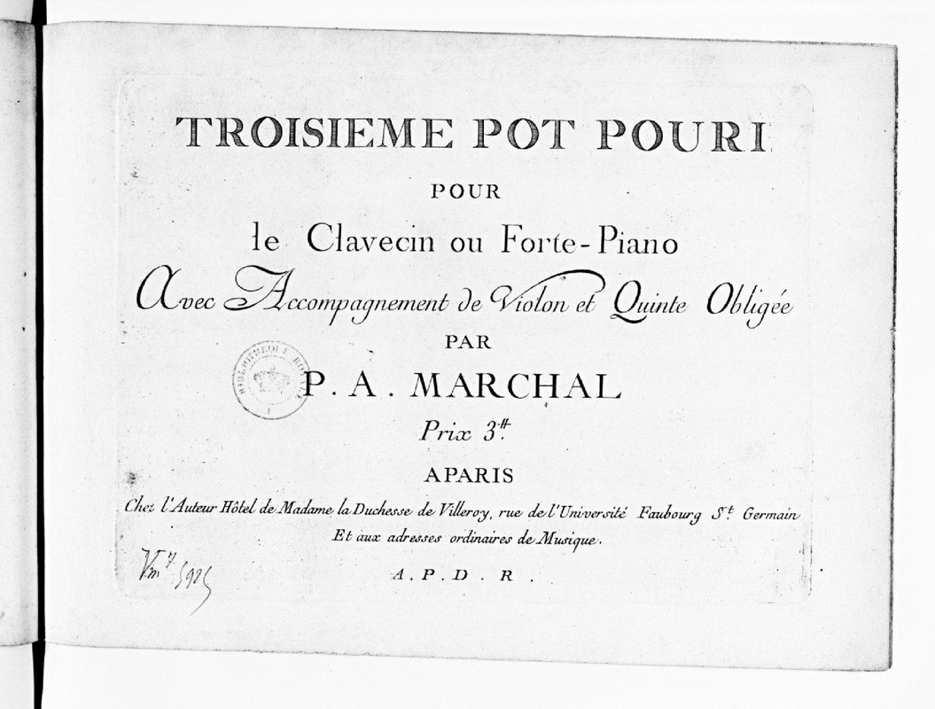 | Alternative. Title | Troisieme Pot Pouri pour le clavecin ou forte-piano avec accompagnement de violon et quinte obligee |