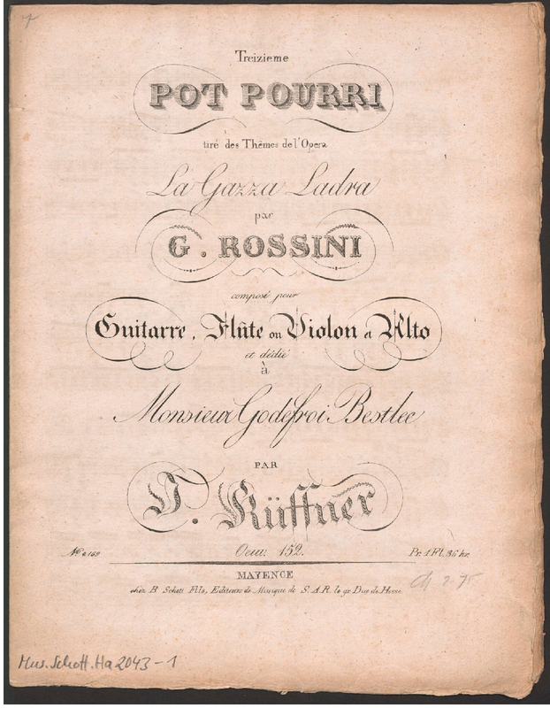 | Alternative. Title | Treizieme Pot pourri tiré des thêmes de l'opéra La Gazza Ladra par G. Rossini composé our Guitarre, Flûte ou Violon et Alto |