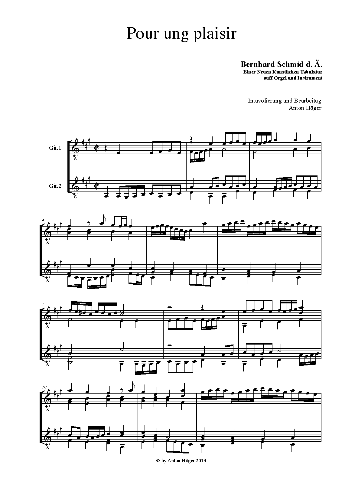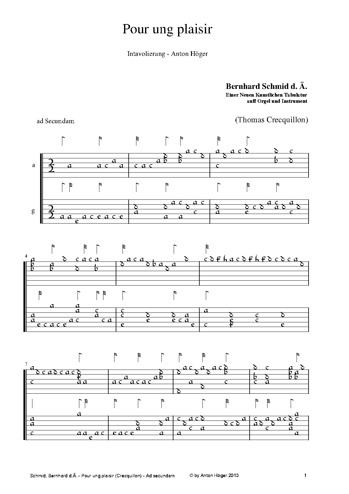 This piece is from the collection Einer Neuen Kunstlichen Tabulatur . . . allen Organisten und angehenden Instrumentisten zu nutz. Grove Music comments: "As the full title indicates, Schmid intended his book for all kinds of keyboard instruments. The book serves as an index of the type of keyboard music performed at that time in church and in the home."