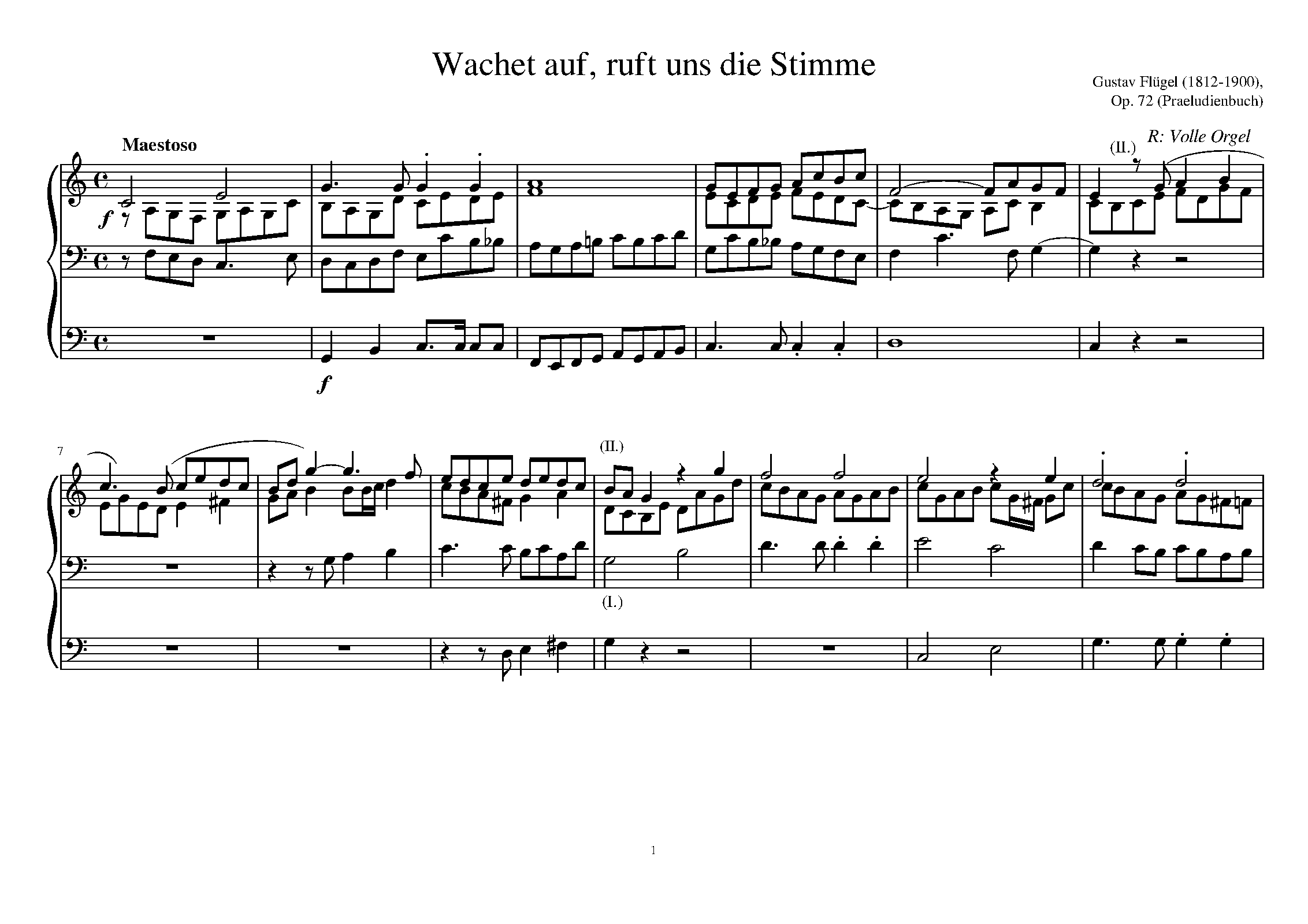 | Extra Information | Opus 72 is mentioned in an extensive work list in Wikipedia's Article on Flügel (German and English), citing scientific literature. Five of the pieces appear in August Stern's collection of Chorale preludes. There has not been a reprint for some time, apparently. A complete edition would be welcome. |