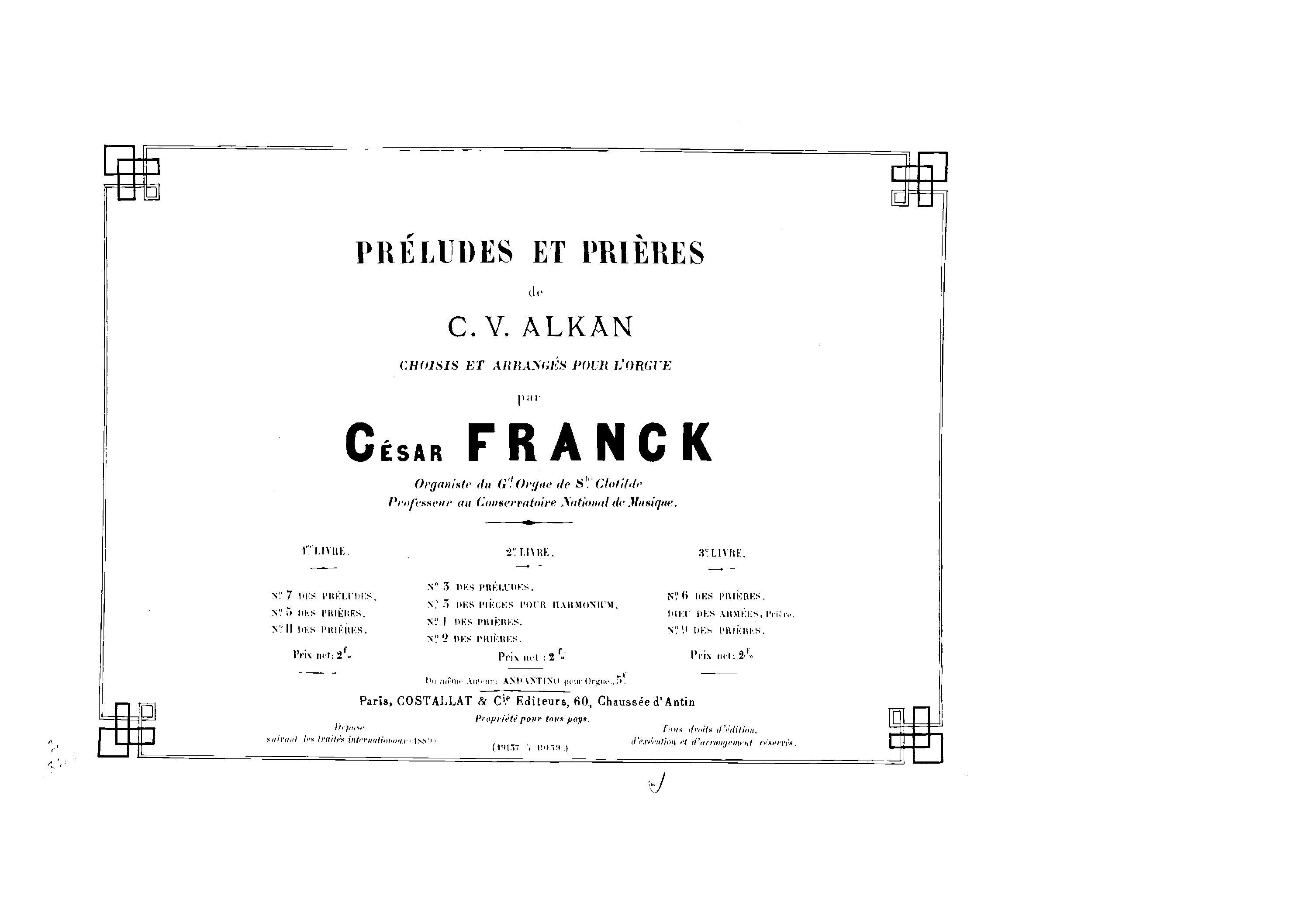 | Alternative. Title | Préludes et prières de C. V. Alkan, choisis et arrangés pour l'orgue par César Franck |