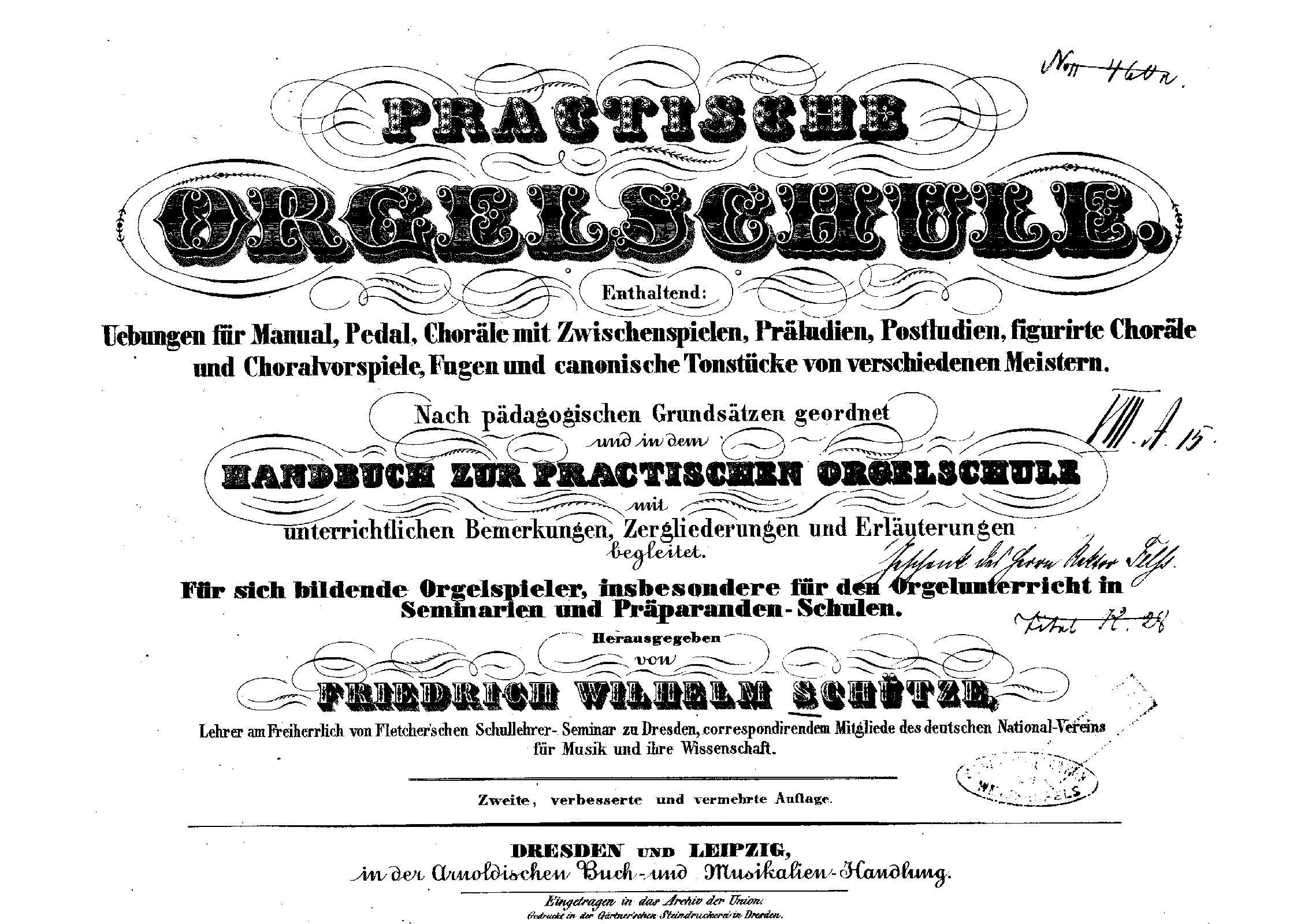 | Alternative. Title | Practische Orgelschule. Enthaltend: Uebungen für Manual, Pedal, Choräle mit Zwischenspielen, Präludien, Postludien, figurirte Choräle und Choralvorspiele, Fugen und canonische Tonstücke von verschiedenen Meistern. Nach pädagogischen Grundsätzen geordnet und in den Handbuch zur Practischen Orgelschule mit unterrichtlichen Bemerkungen, Zergliederungen und Erläuterungen begleitet |