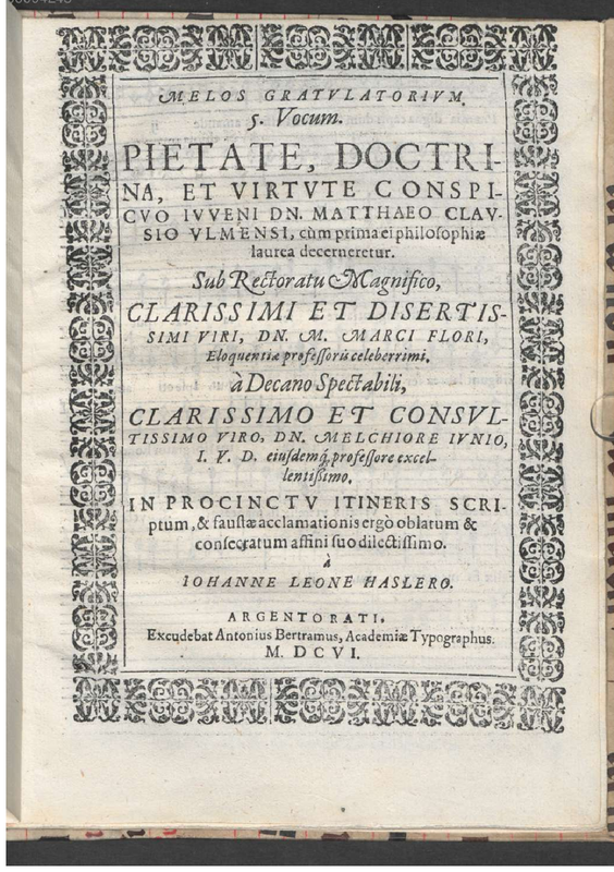 | Alternative. Title | Melos gratulatorium 5. vocum. Pietate, doctrina, et virtute conspicuo iuveni Dn. Matthaeo Clausio Ulmensi, cum prima ei philosophiae laurea decerneretur ... |