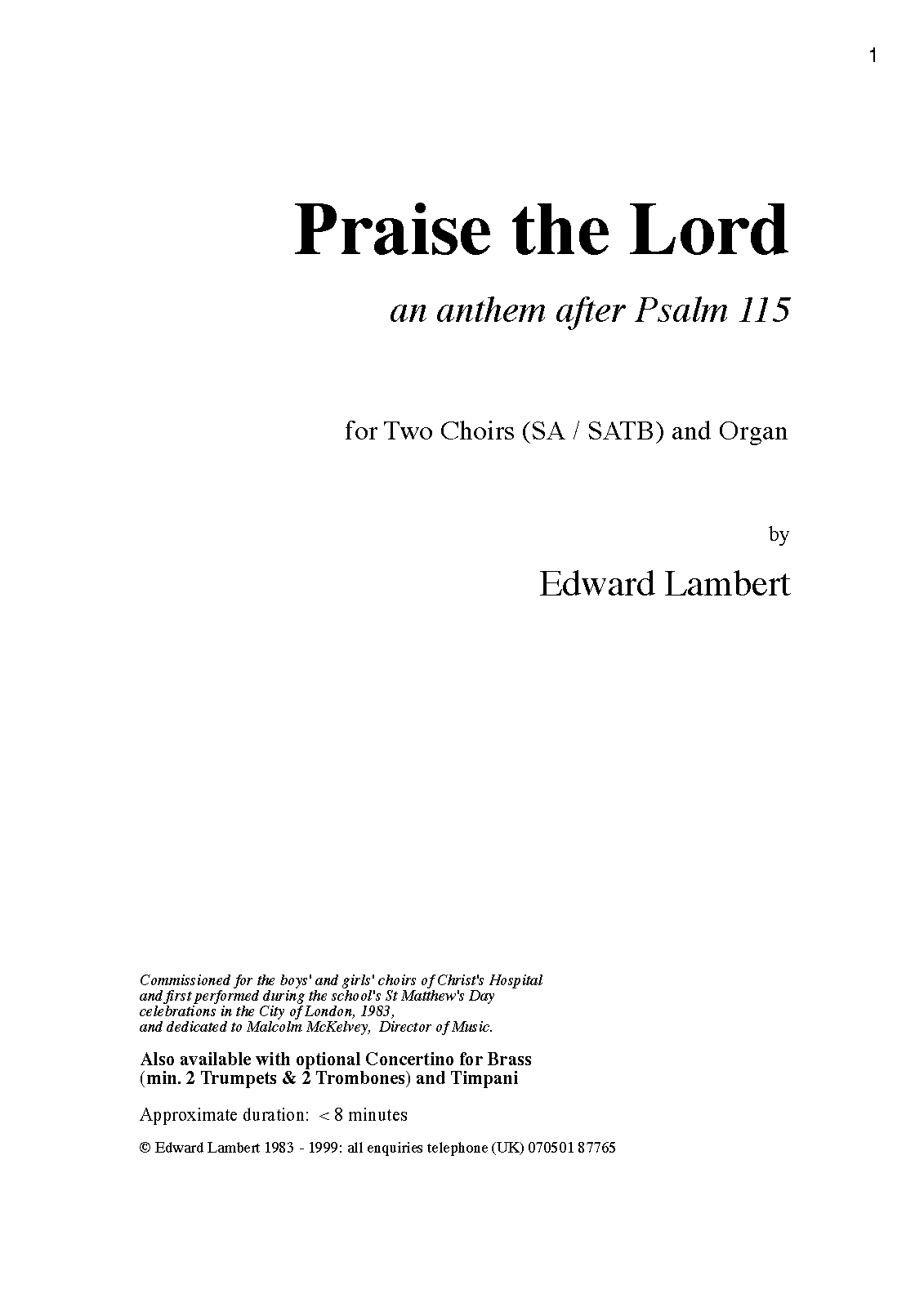 | Instrumentation | SA, SATB, organ and optional Concertino for Brass (min. 2 trumpets, 2 trombones) and timpani |