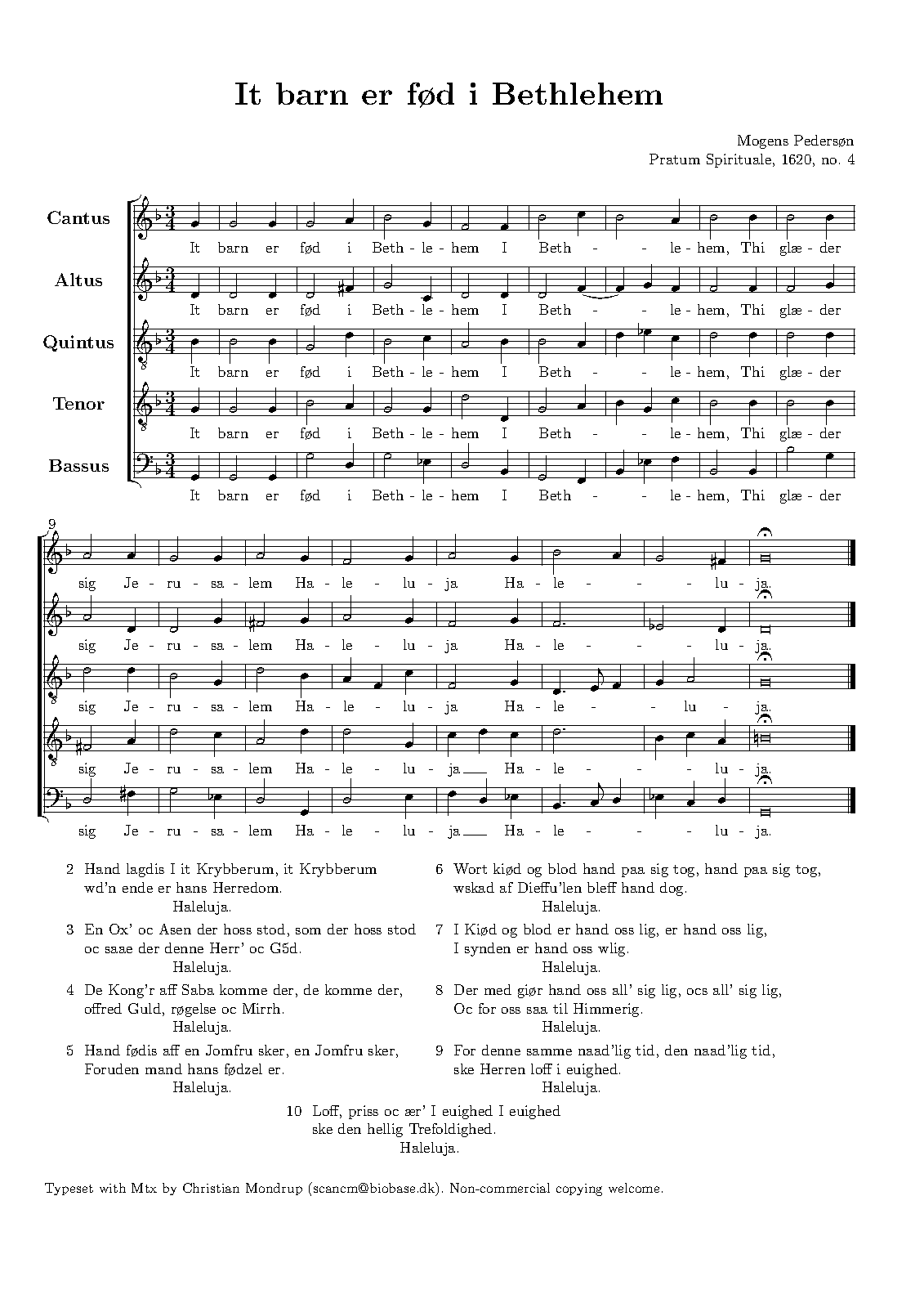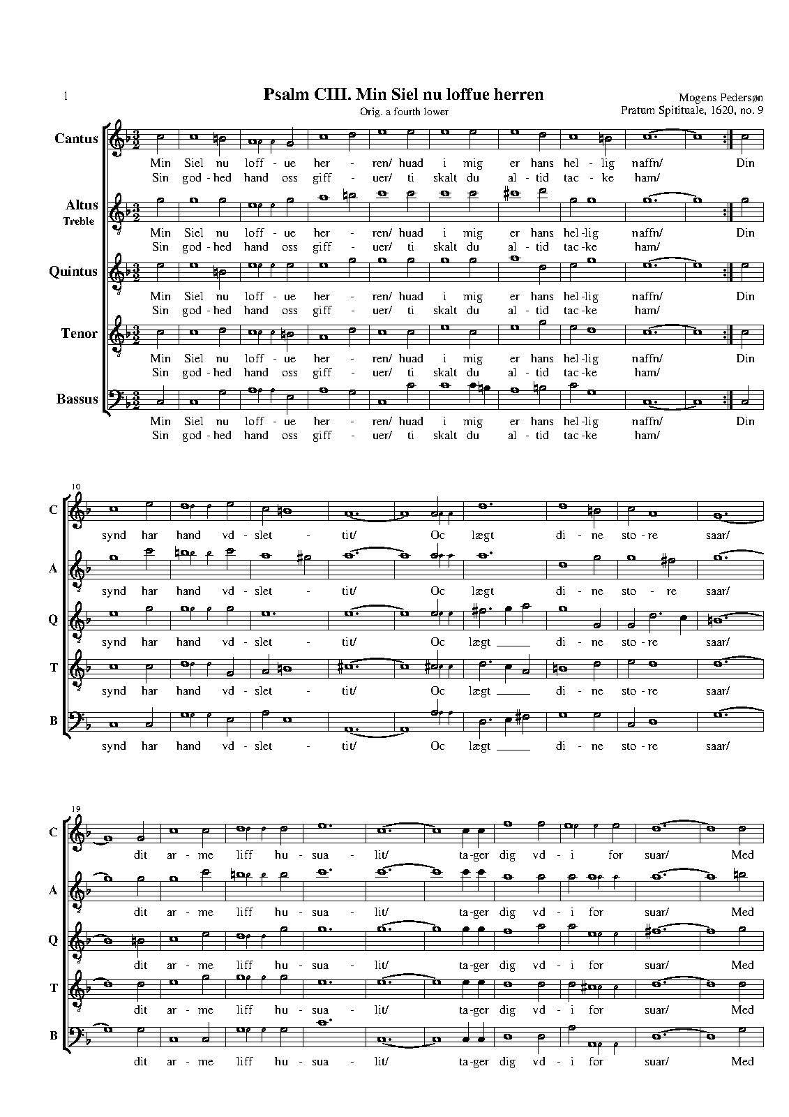 ⇒ 10 more: 6. Kyrie Gud Fader forbarme dig offuer oss • 7. Victimae pascali laudes • 9. Psalm CIII. Min Siel nu loffue herren • 13. Nu bede vi den Helligaand. Score • 13. Nu bede vi den Helligaand. Parts • 30. Forlæ oss med fred naadelig • 33. Missa quinque vocum • 34. Ad te levavi oculos meos • 35. Deus misereatur nostri • Engraving files (Mup, M-Tx, TeX, shell scripts)