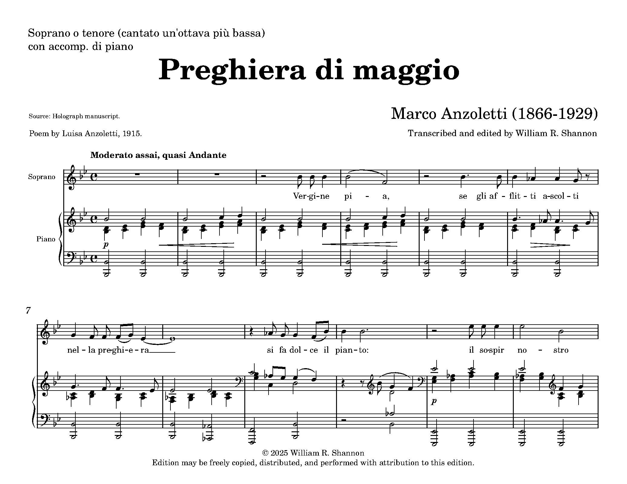 Preghiera di maggio per soprano, o tenore, o baritono con accomp. di piano; per baritono con accomp. organo (o armonium)