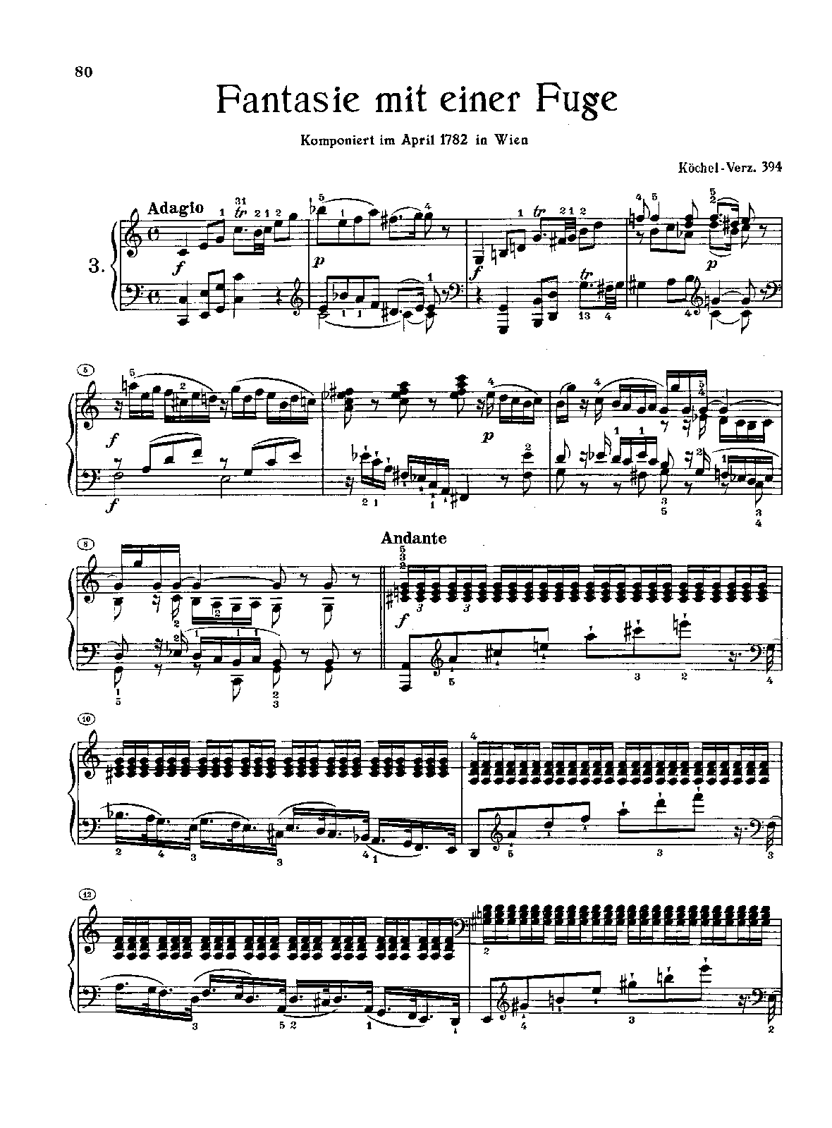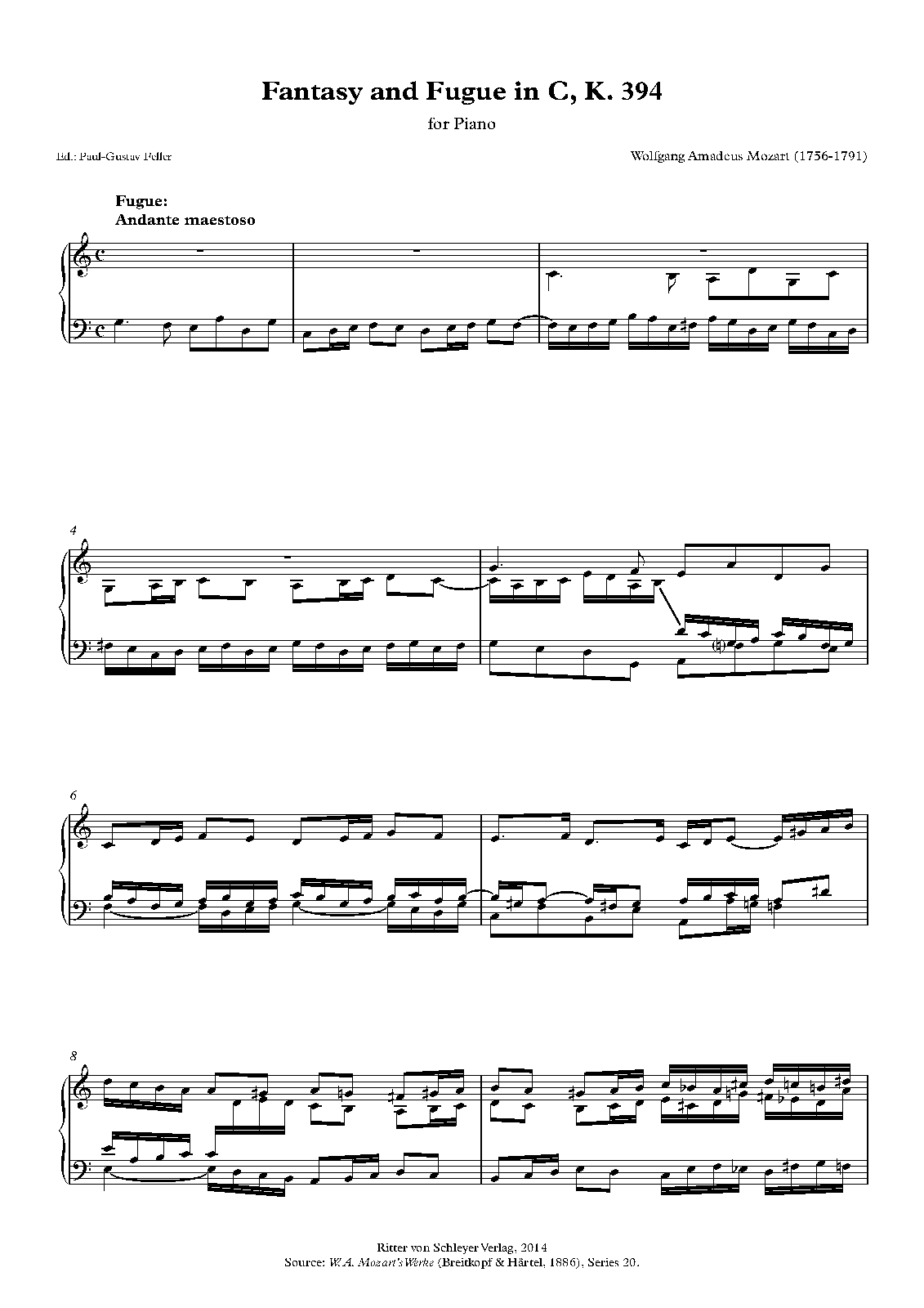 Name Aliases KV 394; KV 383a; Fantasía n.º 1 (Mozart); Prelude and Fugue in C major; K. 394/383a; Prelude and fugue for piano in C major; Fantasy No. 1 with Fugue in C major, K. 394; Fantasy No. 1 with Fugue, K. 394
