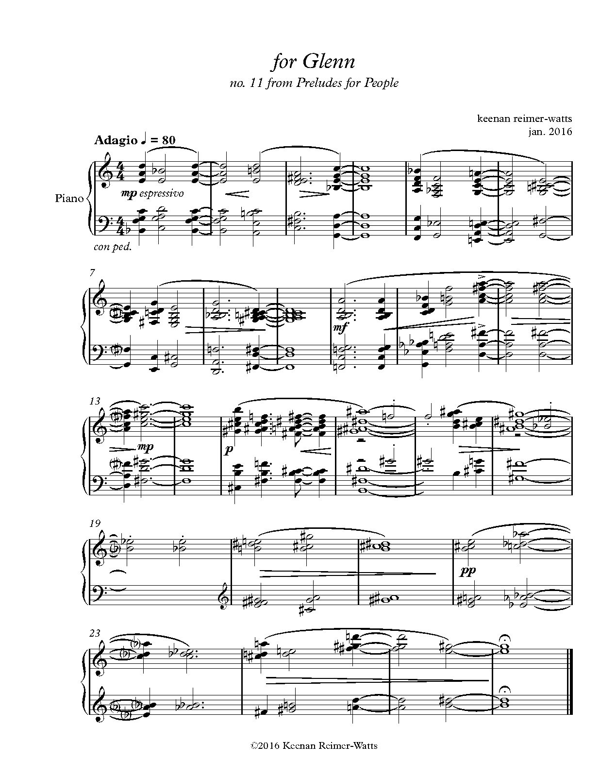 Many of these I have written for specific people in my life, as part of an ongoing series titled 'Preludes for People'. These are small pieces that people contact me for as a commission, or I write for other people as a gift. It has been a huge joy to write for each of these people. I often work from a small piece of material provided to me by the commissioner, such as adjectives, photos, memories, poems, stories, what have you.