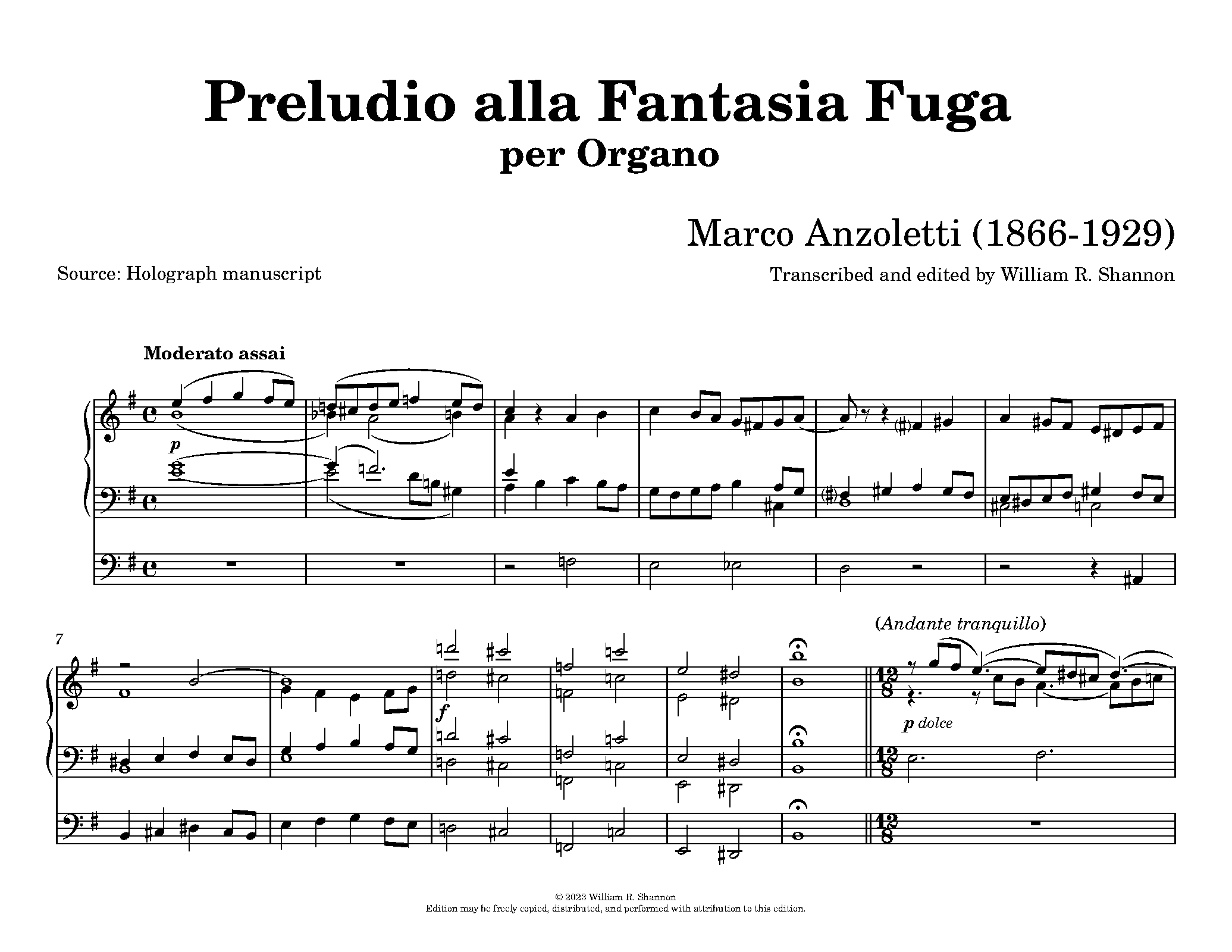 | Extra Information | As this is a prelude to a supposed fugue, the work ends at a B dominant chord, but where's the fugue? Maybe improvisation here, considering Anzoletti is also a good organist? Year provided by BdT as this work is undated. -Sissel Edit: The Fantasia Fuga could be actually Fantasia Sacra for 2 organs. |