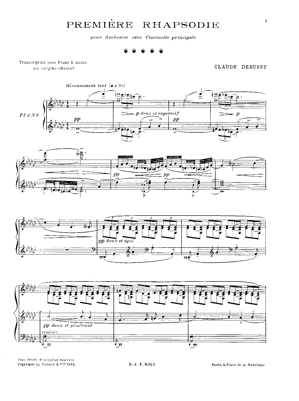 Name Aliases Premiere rhapsodie; First Rhapsody; Rhapsody for clarinet and orchestra; Primera rapsodia; Erste Rhapsodie; rhapsodie pour clarinette et orchestre