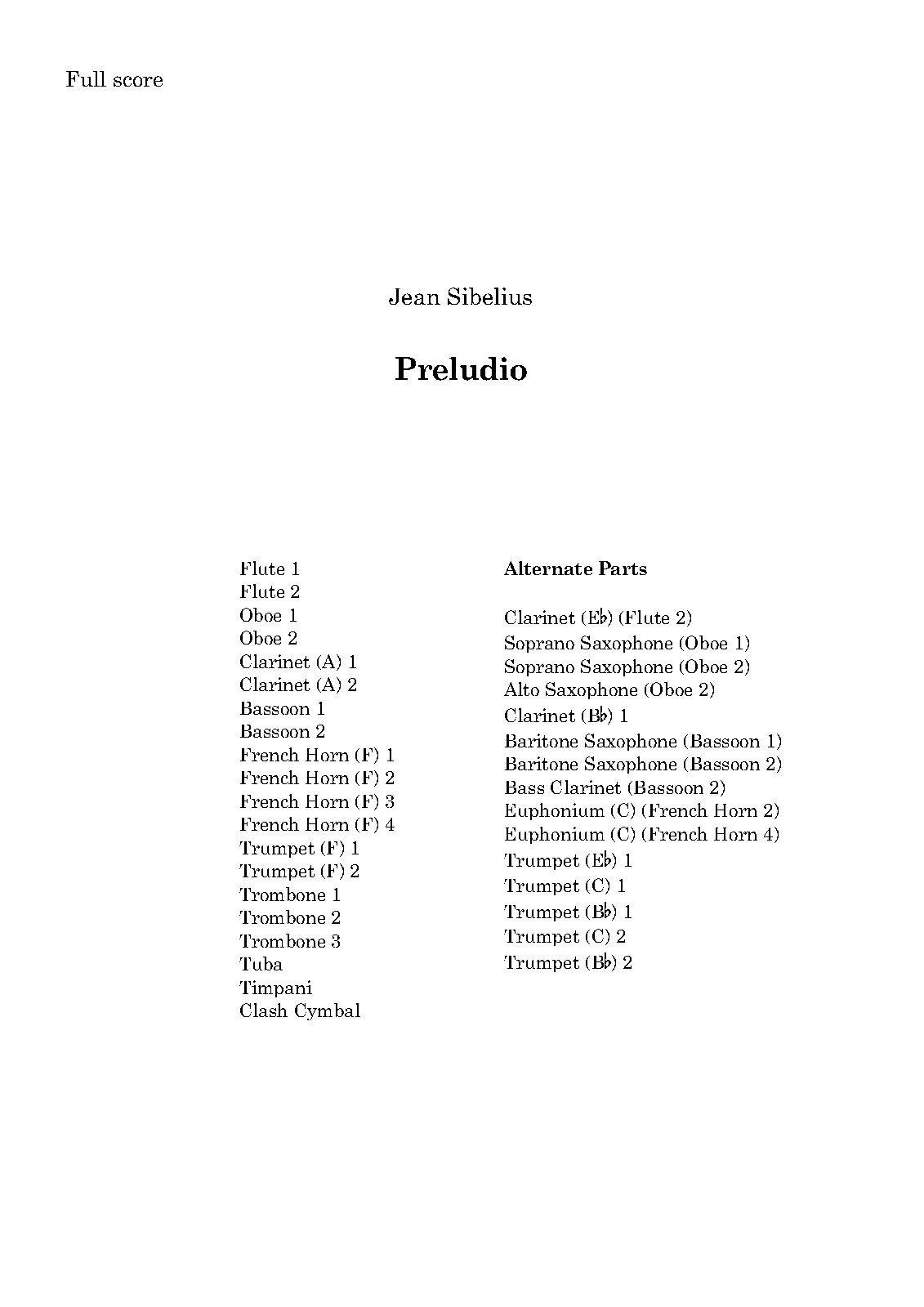 ⇒ 34 more: Flute 2 • Oboe 1 • Oboe 2 • Clarinet (E♭) (ossia Flute 2) • Clarinet (A) 1 • Clarinet (B♭) 1 (ossia Clarinet in A 1) • Clarinet (A) 2 • Bass Clarinet (ossia Bassoon 2) • Soprano Saxophone (ossia Oboe 1) • Soprano Saxophone (ossia Oboe 2) • Alto Saxophone (ossia Oboe 2) • Baritone Saxophone (ossia Bassoon 1) • Baritone Saxophone (ossia Bassoon 2) • Bassoon 1 • Bassoon 2 • French Horn (F) 1 • French Horn (F) 2 • French Horn (F) 3 • French Horn (F) 4 • Trumpet (F) 1 • Trumpet (E♭) 1 (ossia Trumpet in F 1) • Trumpet (C) 1 (ossia Trumpet in F 1) • Trumpet (B♭) 1 (ossia Trumpet in F 1) • Trumpet (F) 2 • Trumpet (C) 2 (ossia Trumpet in F 2) • Trumpet (B♭) 2 (ossia Trumpet in F 2) • Trombone 1 • Trombone 2 • Trombone 3 • Euphonium (C) (ossia French Horn 2) • Euphonium (C) (ossia French Horn 4) • Tuba • Timpani • Clash Cymbal