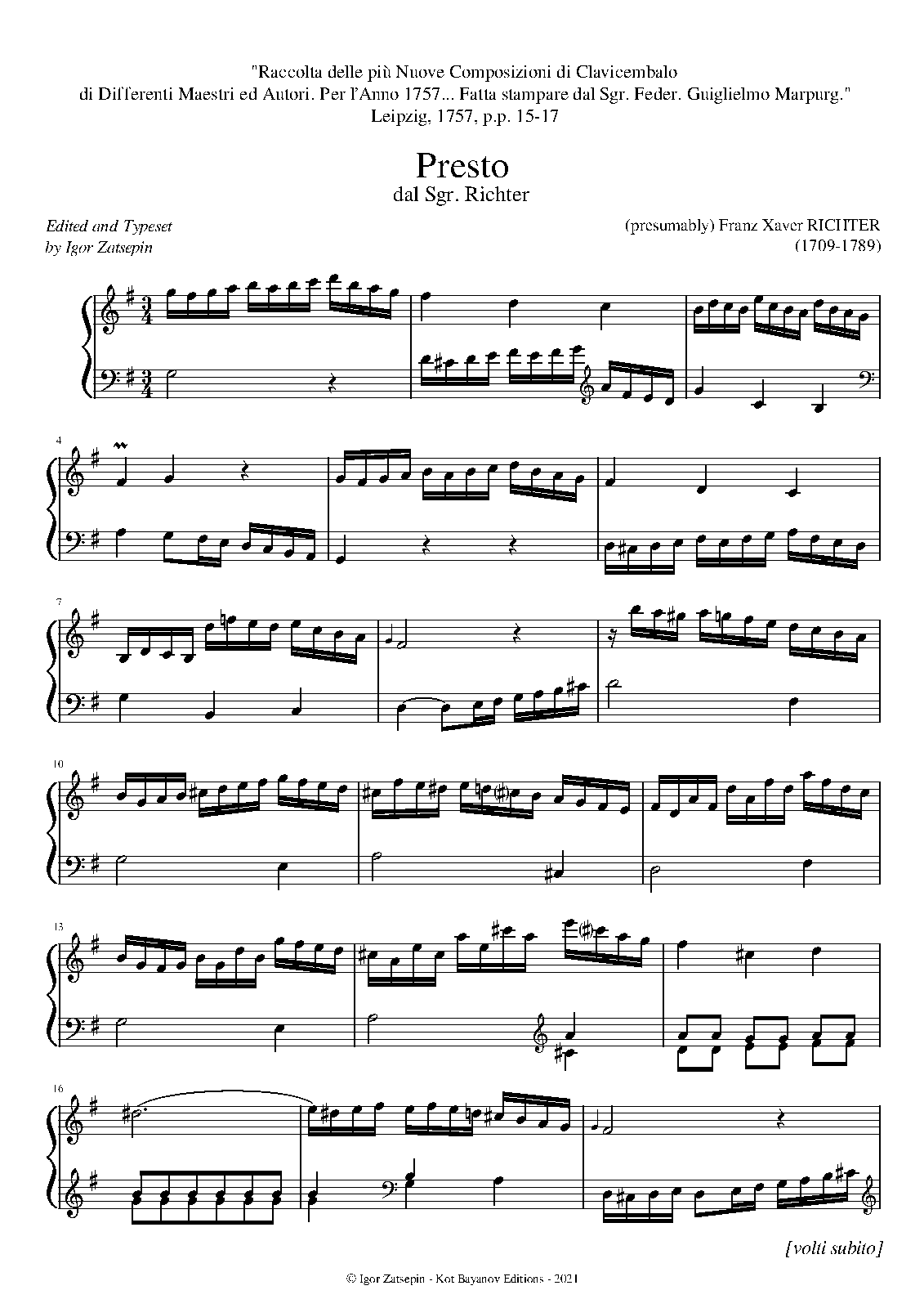 | Extra Information | "Raccolta delle più Nuove Composizioni di Clavicembalo di Differenti Maestri ed Autori. Per l’Anno 1757... Fatta stampare dal Sgr. Feder. Guiglielmo Marpurg." Leipzig, 1757, p.p. 15-17 |
