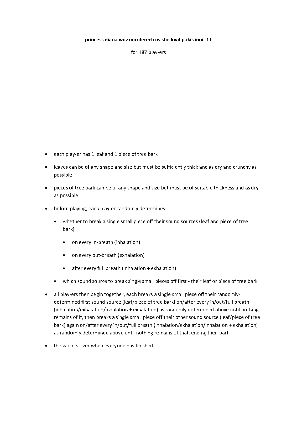 | Instrumentation | 187 play-ers, each with 1 leaf and 1 piece of tree bark |