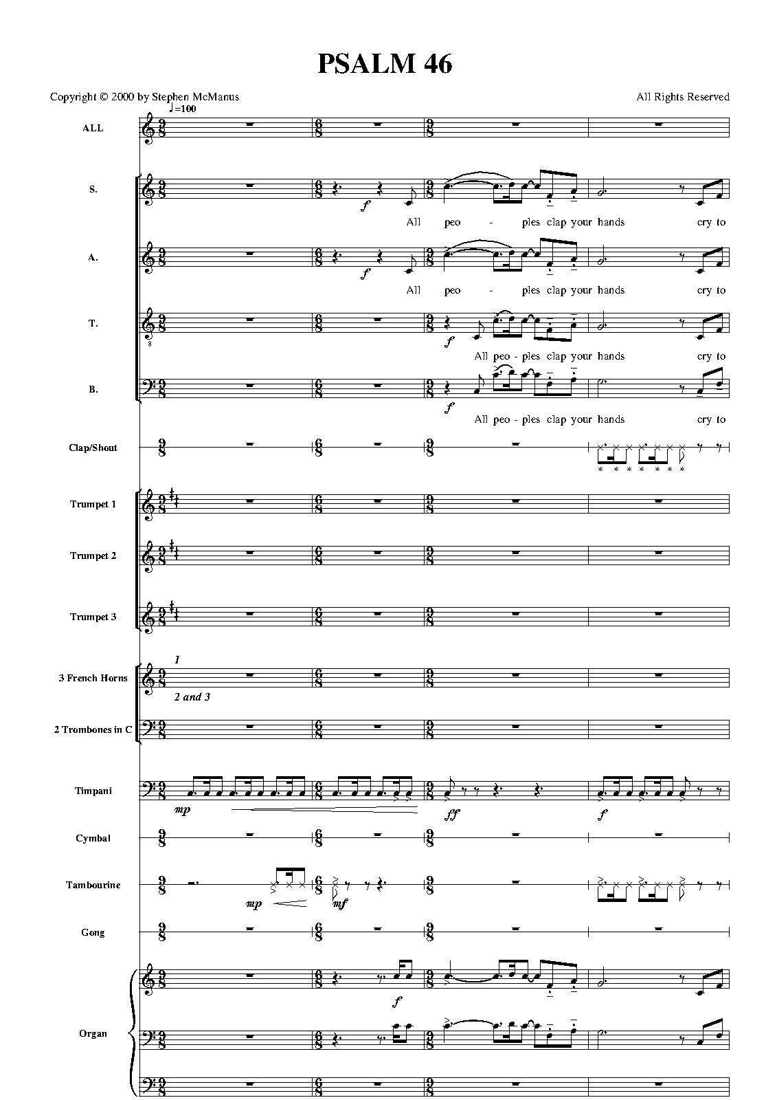 | Instrumentation | unison chorus, mixed chorus (SATB), 3 horns, 3 trumpets, 2 trombones, timpani, cymbal, tambourine, gong, organ |