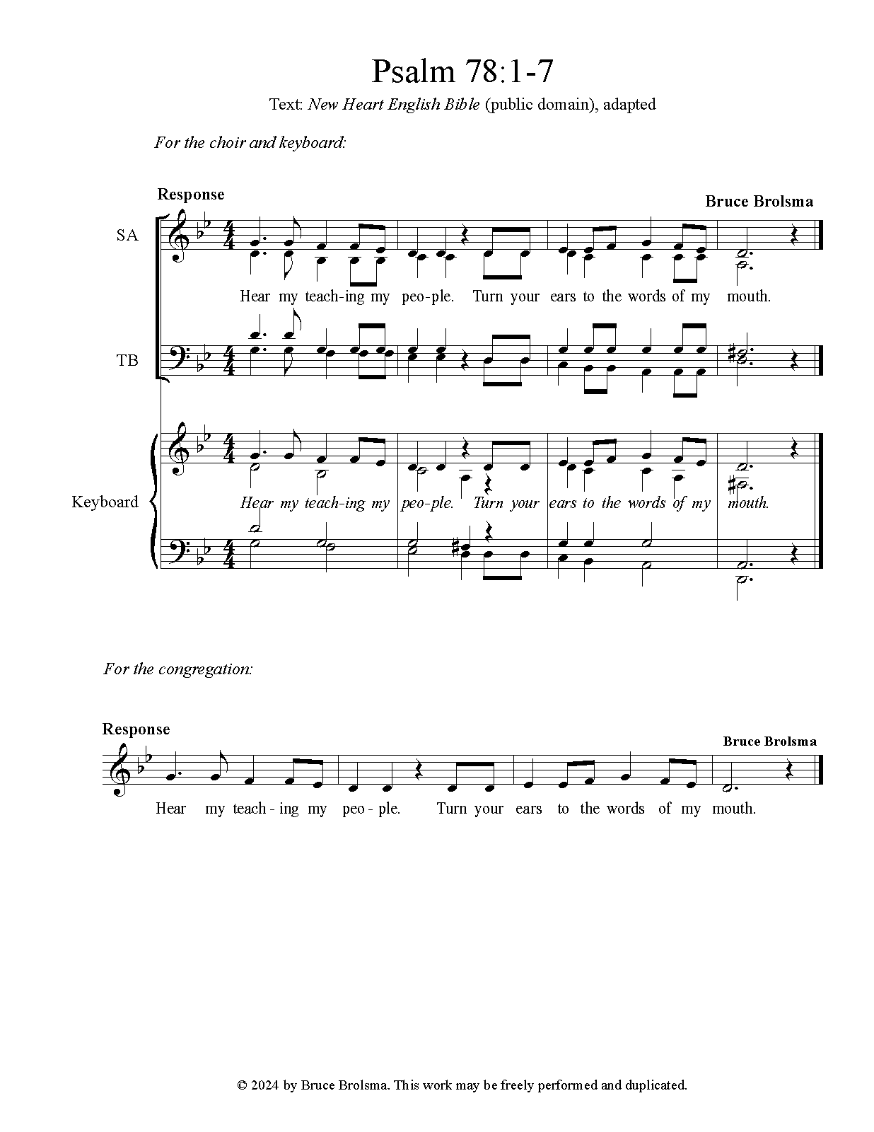 Response and verses may be performed by a choir and/or the congregation. Music and words may be accessed by the engraving file (MusicXML) or via screenshots of the PDF file. |