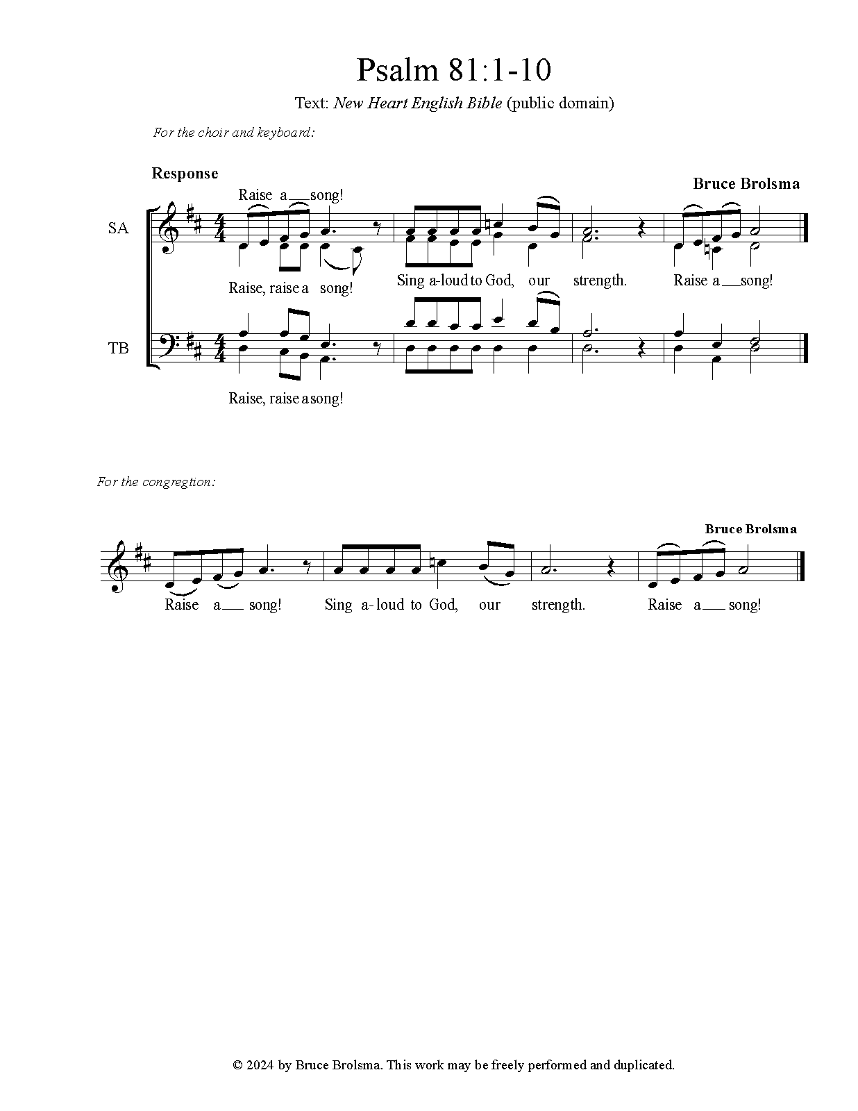 Response and verses may be performed by a choir or the congregation. Music and words may be accessed by the engraving file (MusicXML) or via screenshots of the PDF file. |