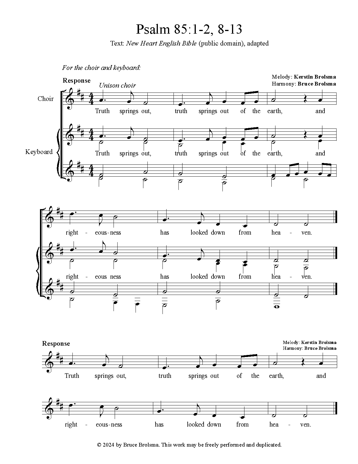 Response and verses may be performed by a choir or the congregation. Music and words may be accessed by the engraving file (MusicXML) or via screenshots of the PDF file. Melody by Kerstin Brolsma (b. 1993). |