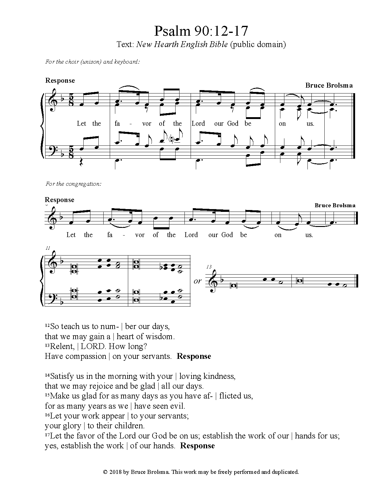| Instrumentation | Psalm 90: 1-8, 12 - 4 voices (SATB), unison congregation, piano Psalm 90: 12-17 - unison voices, keyboard |