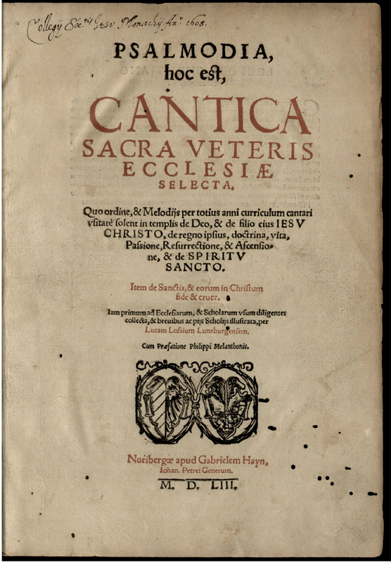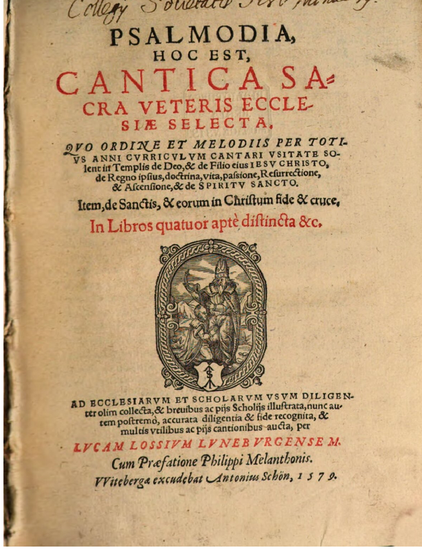 Psalmodia, hoc est, Cantica Sacra Veteris Ecclesiae selecta. Qup ordine, & Melodijs per totius anni curriculum cantari vsitate solent in templis de Deo, & de filio eius Iesv Christo, de regno ipsius, doctrina, vita, Passione, Resurrectione, & Ascensione, & de Spiritv Sancto.