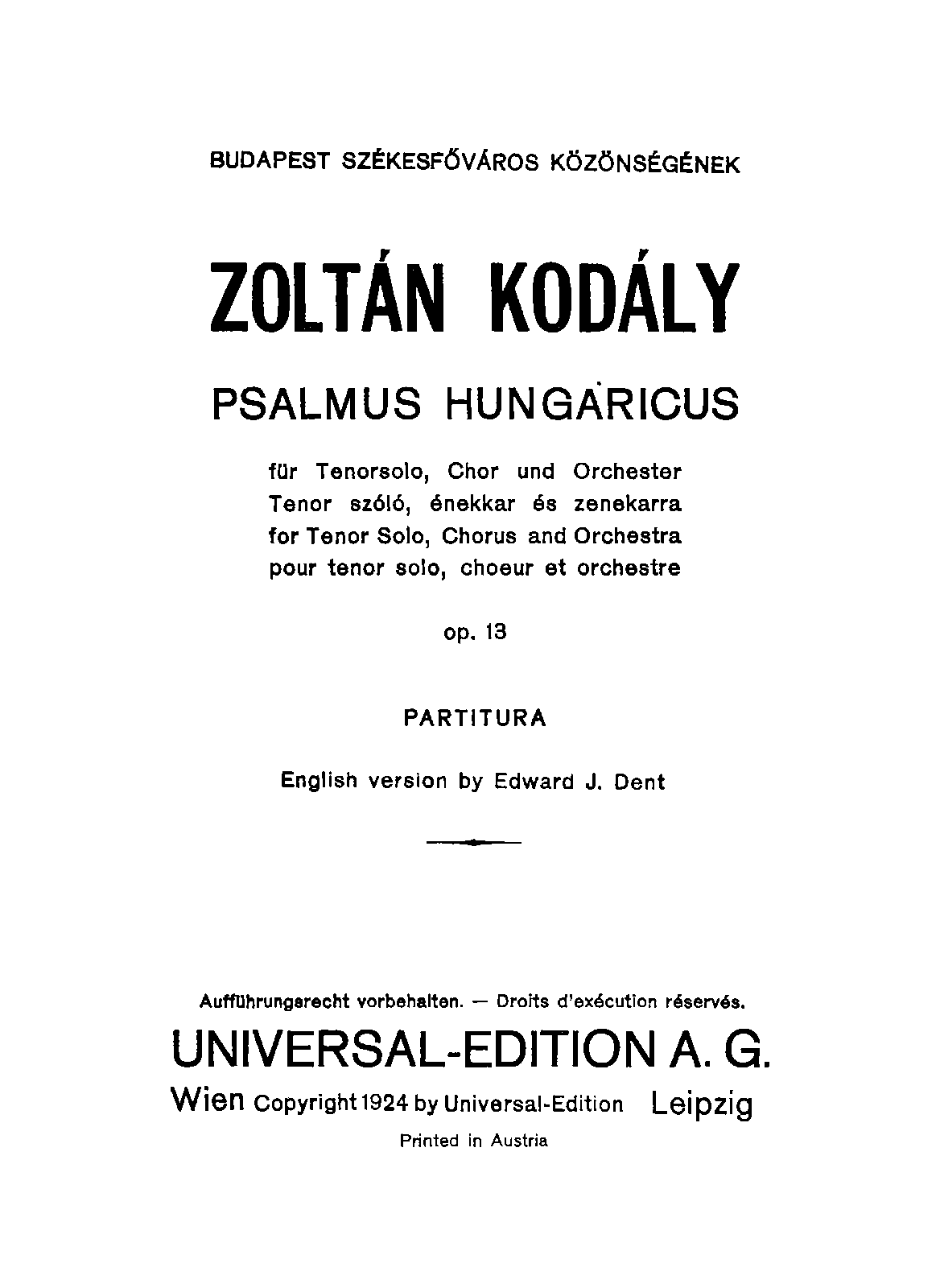 | Dedication | Budapest Székesfőváros közönségének (To the audience of Budapest) |