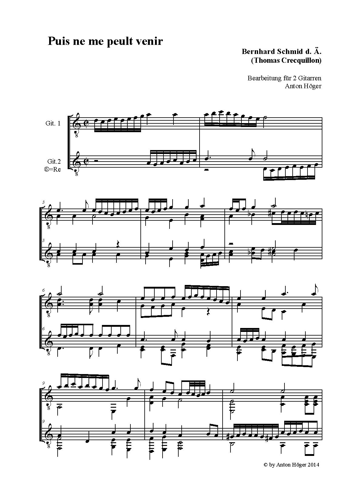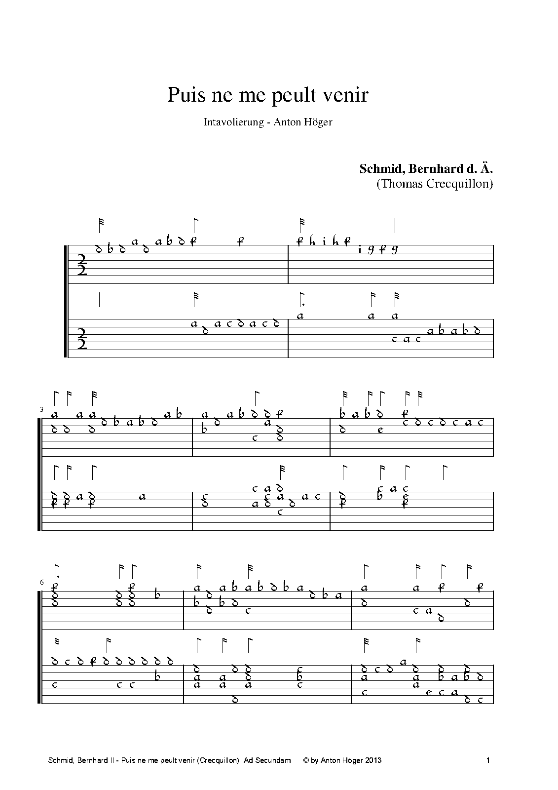 This piece is from the collection Einer Neuen Kunstlichen Tabulatur . . . allen Organisten und angehenden Instrumentisten zu nutz. Grove Music comments: "As the full title indicates, Schmid intended his book for all kinds of keyboard instruments. The book serves as an index of the type of keyboard music performed at that time in church and in the home."