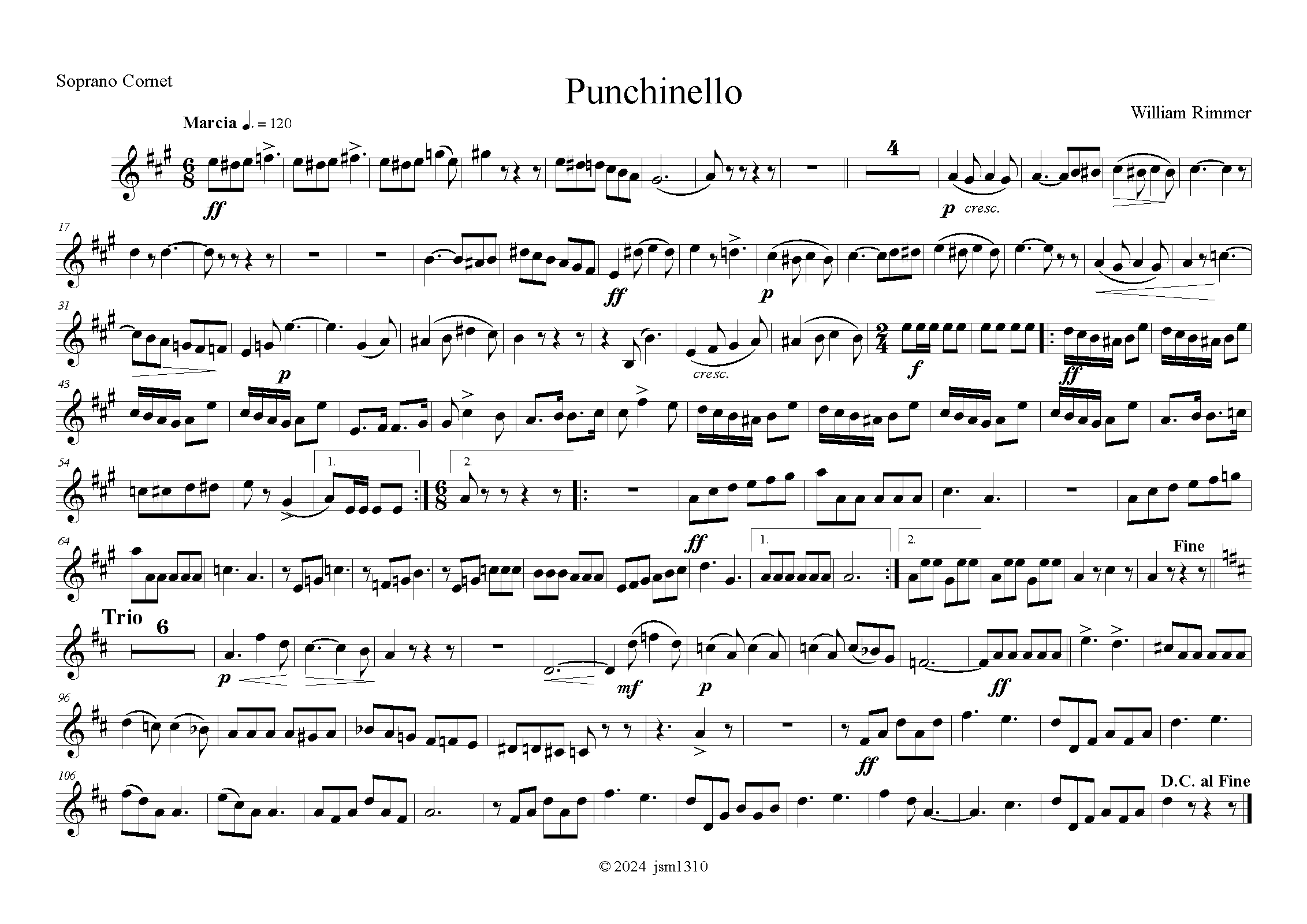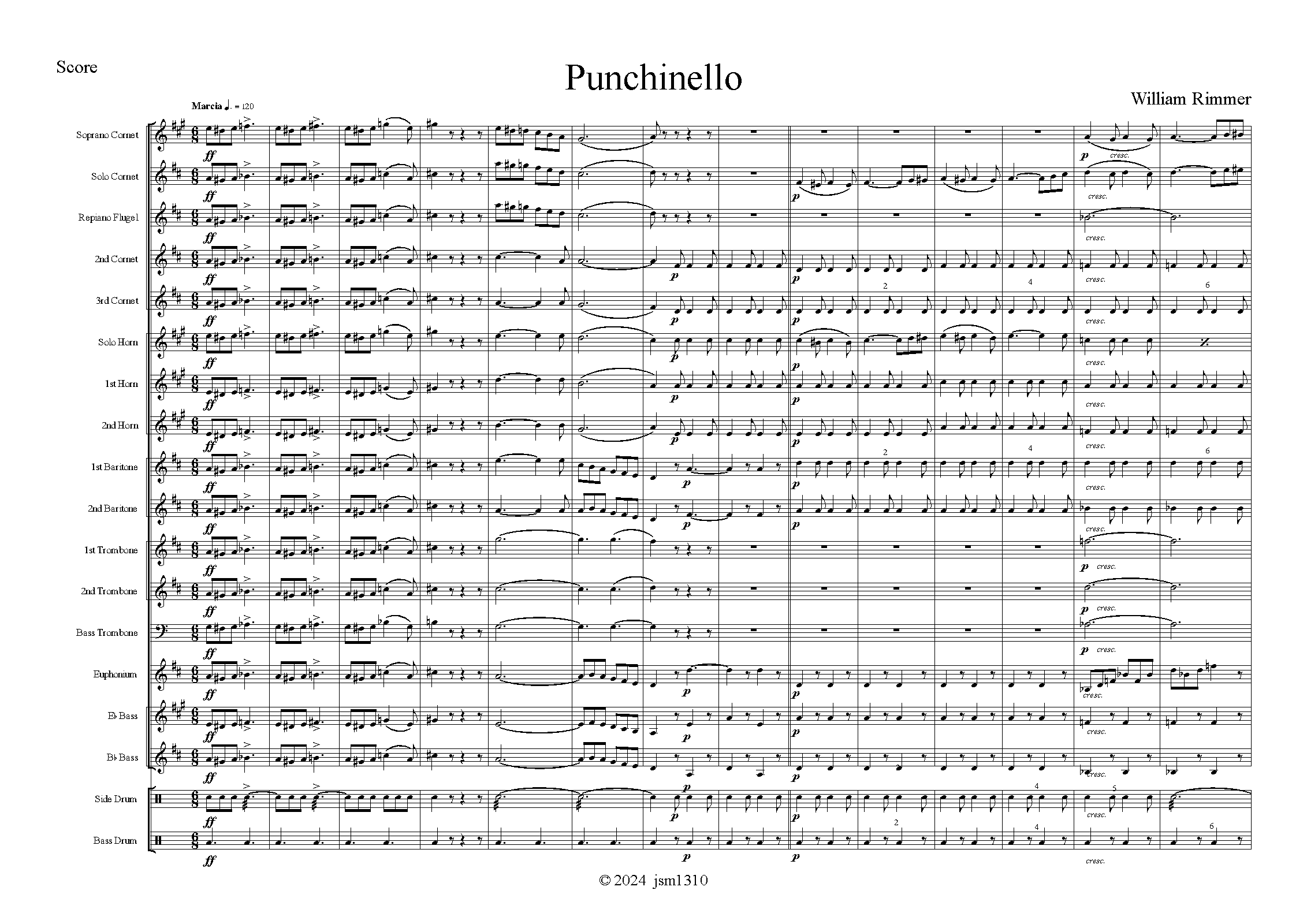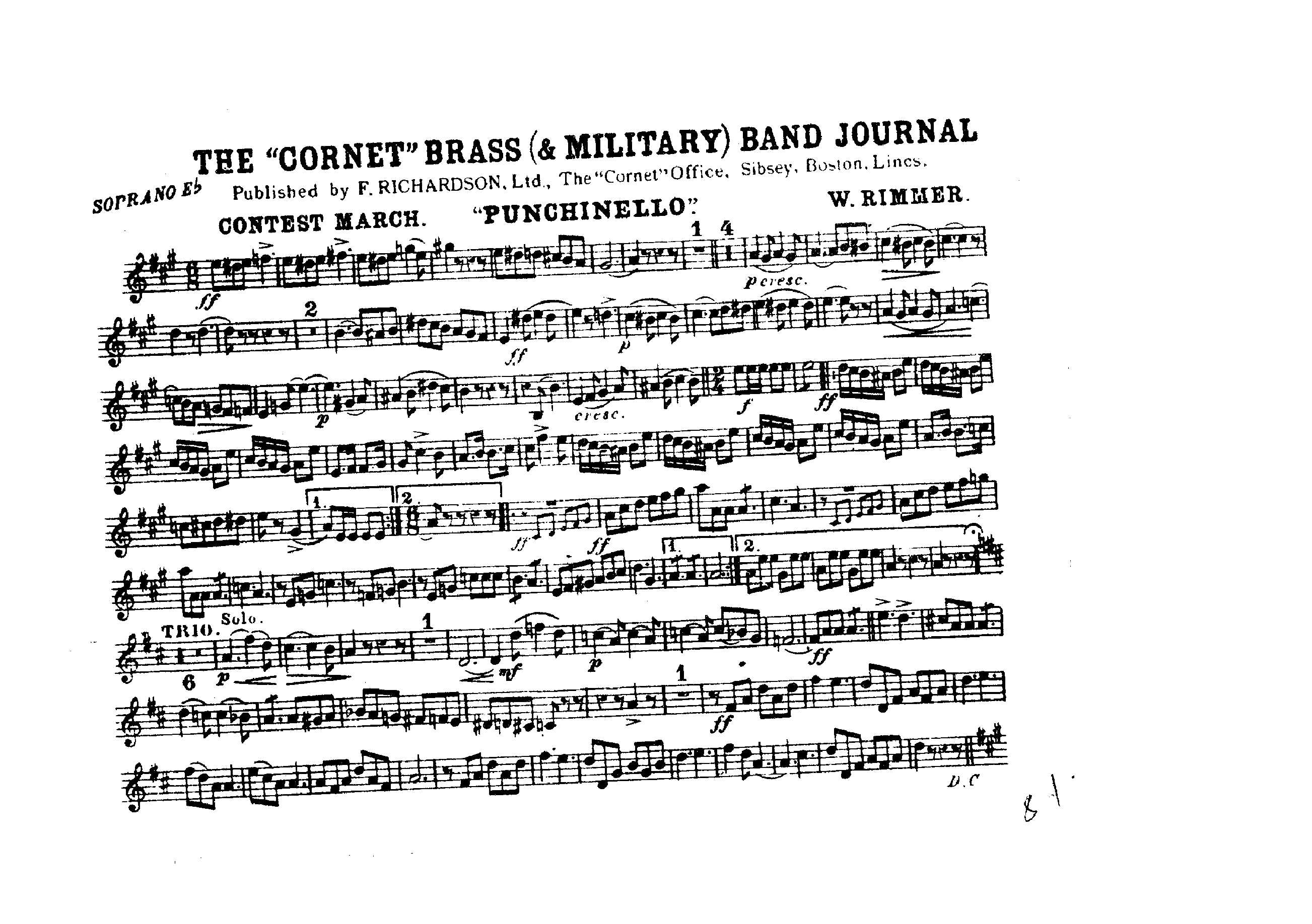 Brass Band: soprano E♭, solo cornet B♭, repiano B♭, 2nd cornet B♭, 3rd cornet B♭, solo tenor B♭, 1st tenor E♭, 2nd tenor E♭, 1st baritone B♭, 2nd baritone B♭, 1st trombone, 2nd trombone, bass trombone, euphonium B♭, bass E♭, side drum, bass drum