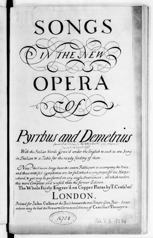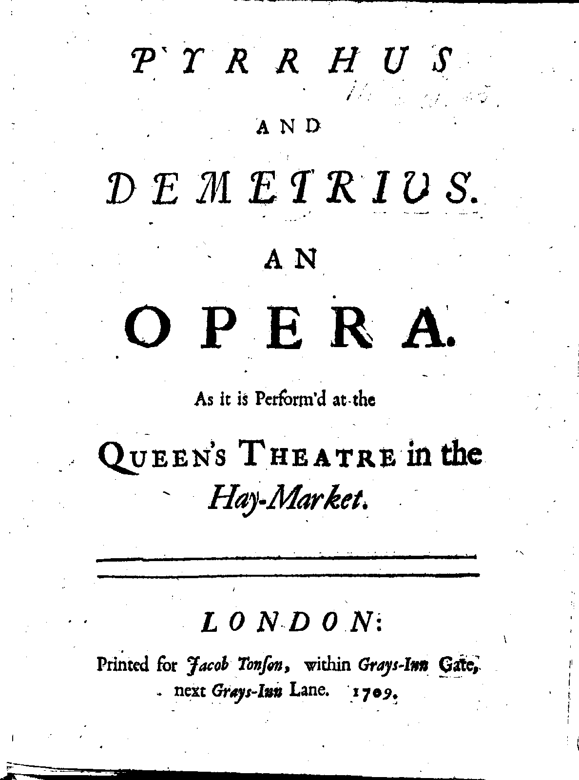 | Extra Information | Haym's Pyrrhus and Demetrius was an English adaptation of 1694 opera Pirro e Demetrio by Alessandro Scarlatti. |