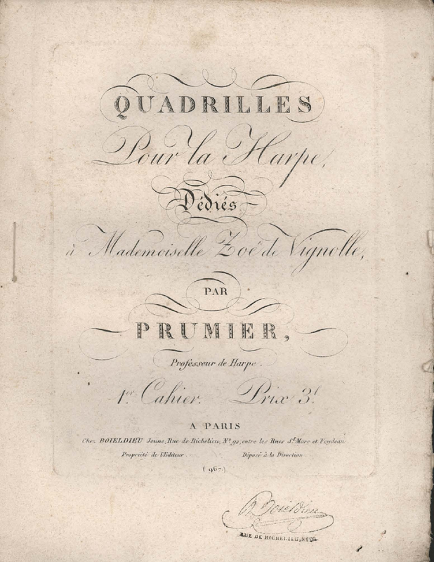 There were two XIX century harpists, probably related, bearing that name, according to Music Sack : Prumier, Ange Conrad Antoine (b. 1820 d. 1884) and Prumier, Antoine (b. 1794 d. 1868 a. 1830-1831). The present work can be attributed to the latter with some degree of certainty (possible date for the edition : ca.1820? and the dedicatee, necessarily young and one of this harp professor's most rewarding pupils, might be the Zoë Claire DE VIGNOLLE (1801-1877) who figures in one Geneanet family tree)