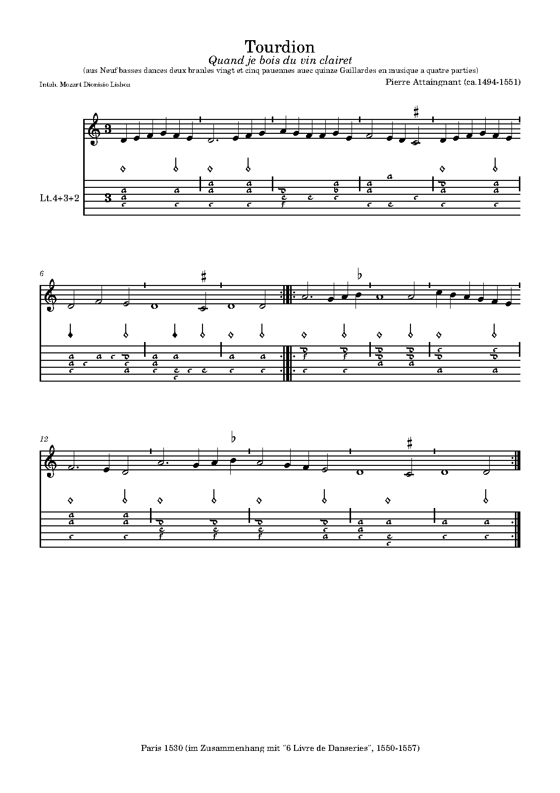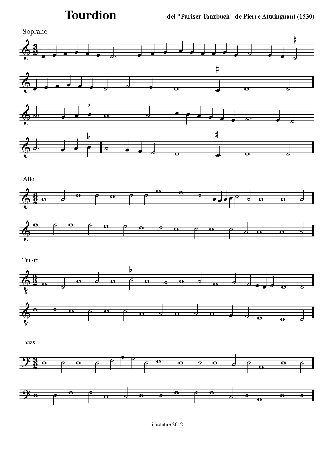 | Extra Information | A "Tourdion" is a dance similar to a gavotte. The word "tourdion" is from the French verb meaning "to twist". |