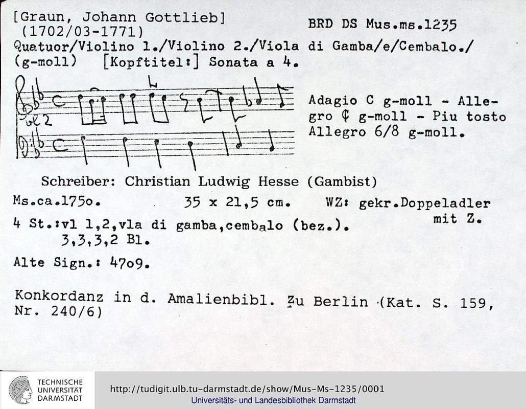 | Manuscript Sources | 2 violins, viola, continuo (D-Bsa, SA 3389) 2 violins, viola, continuo (D-Bsa, SA 3371) |