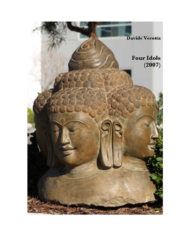 Quattro Idoli (Four Idols) is composed of four movements all ending with the same short motive. The sections make very little reference to each other, but at the end of the piece they do so extensively and quite quickly. For a metaphor of the structure of the piece think of it as a four-sided sculpture. One section to each side, and the short motive marking the edges of the sculpture. Now think of the sculpture rotating in front of your eyes but stopping to let you look at each face. Stop - Rotate - Stop - Rotate -Stop - Rotate - Stop. Before it completes a full circle (that is, before it goes back to the first section) it spins quickly to come to a stop on an edge. The edge, the last time you hear the short motive, is all is left of the sculpture.